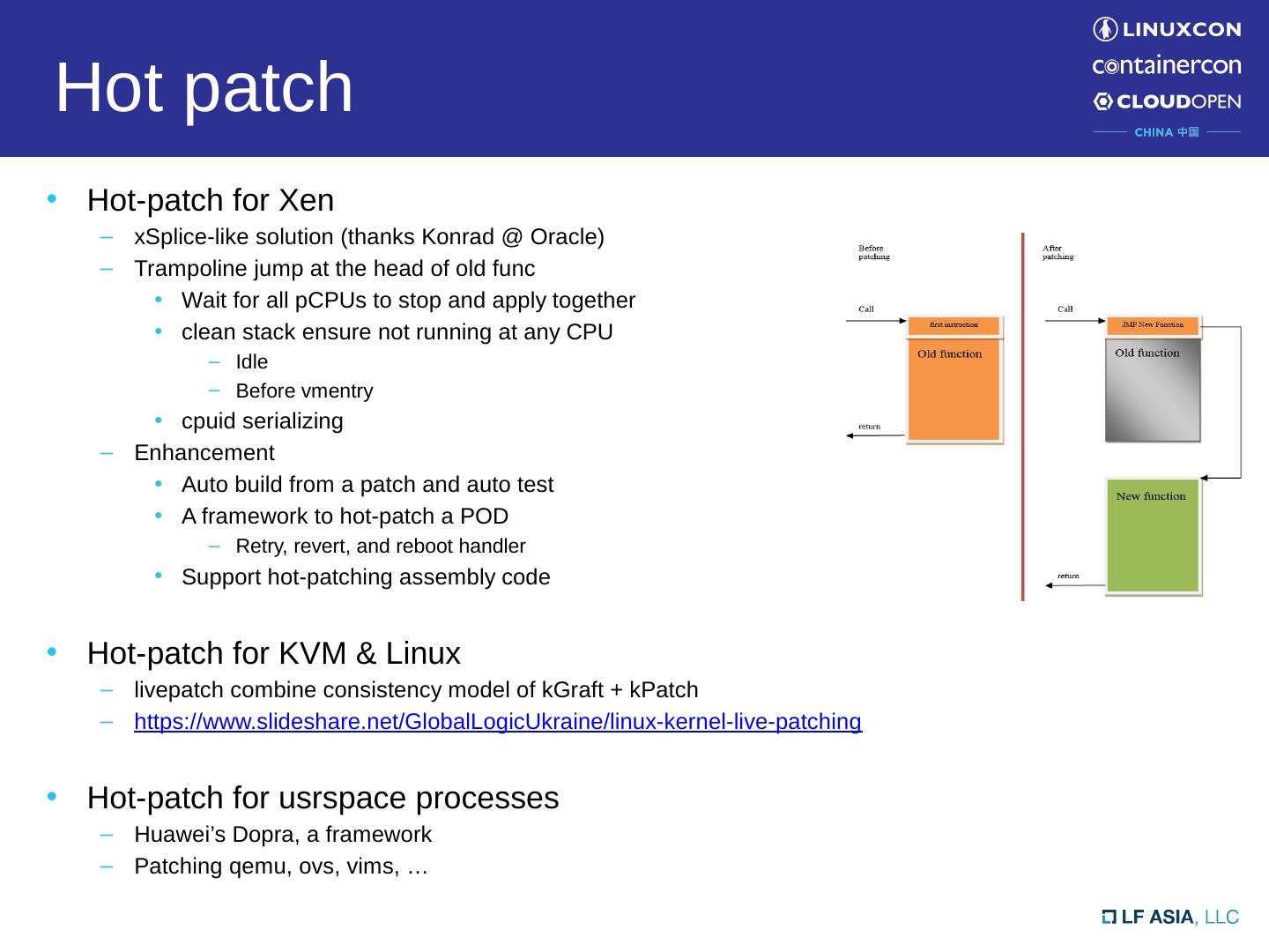 6 .Hot patch H ot-patch for Xen xSplice -like solution (thanks Konrad @ Oracle) Trampoline jump at the head of old func Wait for all pCPUs to stop and apply together clean stack ensure not running at any CPU Idle Before vmentry cpuid serializing Enhancement Auto build from a patch and auto test A framework to hot-patch a POD Retry, revert, and reboot handler Support hot-patching assembly code Hot-patch for KVM & Linux livepatch combine consistency model of kGraft + kPatch https:// www.slideshare.net/GlobalLogicUkraine/linux-kernel-live-patching Hot-patch for usrspace processes Huawei’s Dopra , a framework Patching qemu , ovs , vims, …