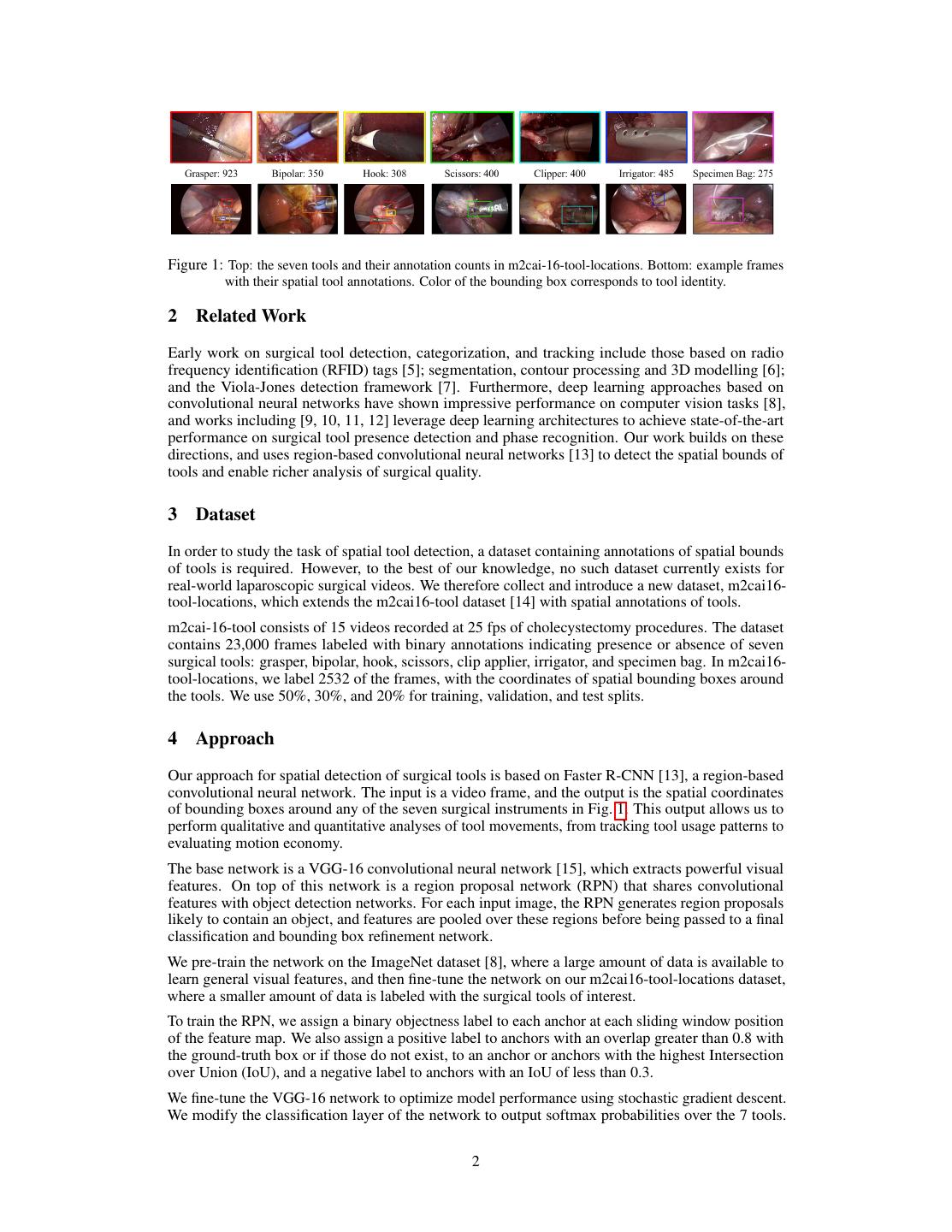 2 .Figure 1: Top: the seven tools and their annotation counts in m2cai-16-tool-locations. Bottom: example frames with their spatial tool annotations. Color of the bounding box corresponds to tool identity. 2 Related Work Early work on surgical tool detection, categorization, and tracking include those based on radio frequency identification (RFID) tags [5]; segmentation, contour processing and 3D modelling [6]; and the Viola-Jones detection framework [7]. Furthermore, deep learning approaches based on convolutional neural networks have shown impressive performance on computer vision tasks [8], and works including [9, 10, 11, 12] leverage deep learning architectures to achieve state-of-the-art performance on surgical tool presence detection and phase recognition. Our work builds on these directions, and uses region-based convolutional neural networks [13] to detect the spatial bounds of tools and enable richer analysis of surgical quality. 3 Dataset In order to study the task of spatial tool detection, a dataset containing annotations of spatial bounds of tools is required. However, to the best of our knowledge, no such dataset currently exists for real-world laparoscopic surgical videos. We therefore collect and introduce a new dataset, m2cai16- tool-locations, which extends the m2cai16-tool dataset [14] with spatial annotations of tools. m2cai-16-tool consists of 15 videos recorded at 25 fps of cholecystectomy procedures. The dataset contains 23,000 frames labeled with binary annotations indicating presence or absence of seven surgical tools: grasper, bipolar, hook, scissors, clip applier, irrigator, and specimen bag. In m2cai16- tool-locations, we label 2532 of the frames, with the coordinates of spatial bounding boxes around the tools. We use 50%, 30%, and 20% for training, validation, and test splits. 4 Approach Our approach for spatial detection of surgical tools is based on Faster R-CNN [13], a region-based convolutional neural network. The input is a video frame, and the output is the spatial coordinates of bounding boxes around any of the seven surgical instruments in Fig. 1. This output allows us to perform qualitative and quantitative analyses of tool movements, from tracking tool usage patterns to evaluating motion economy. The base network is a VGG-16 convolutional neural network [15], which extracts powerful visual features. On top of this network is a region proposal network (RPN) that shares convolutional features with object detection networks. For each input image, the RPN generates region proposals likely to contain an object, and features are pooled over these regions before being passed to a final classification and bounding box refinement network. We pre-train the network on the ImageNet dataset [8], where a large amount of data is available to learn general visual features, and then fine-tune the network on our m2cai16-tool-locations dataset, where a smaller amount of data is labeled with the surgical tools of interest. To train the RPN, we assign a binary objectness label to each anchor at each sliding window position of the feature map. We also assign a positive label to anchors with an overlap greater than 0.8 with the ground-truth box or if those do not exist, to an anchor or anchors with the highest Intersection over Union (IoU), and a negative label to anchors with an IoU of less than 0.3. We fine-tune the VGG-16 network to optimize model performance using stochastic gradient descent. We modify the classification layer of the network to output softmax probabilities over the 7 tools. 2