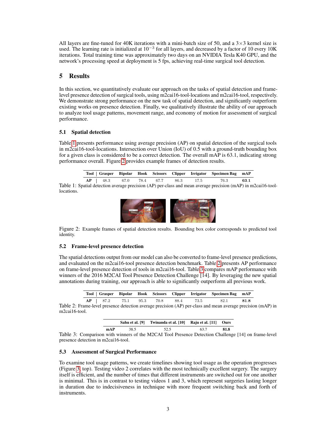 3 .All layers are fine-tuned for 40K iterations with a mini-batch size of 50, and a 3×3 kernel size is used. The learning rate is initialized at 10−3 for all layers, and decreased by a factor of 10 every 10K iterations. Total training time was approximately two days on an NVIDIA Tesla K40 GPU, and the network’s processing speed at deployment is 5 fps, achieving real-time surgical tool detection. 5 Results In this section, we quantitatively evaluate our approach on the tasks of spatial detection and frame- level presence detection of surgical tools, using m2cai16-tool-locations and m2cai16-tool, respectively. We demonstrate strong performance on the new task of spatial detection, and significantly outperform existing works on presence detection. Finally, we qualitatively illustrate the ability of our approach to analyze tool usage patterns, movement range, and economy of motion for assessment of surgical performance. 5.1 Spatial detection Table 1 presents performance using average precision (AP) on spatial detection of the surgical tools in m2cai16-tool-locations. Intersection over Union (IoU) of 0.5 with a ground-truth bounding box for a given class is considered to be a correct detection. The overall mAP is 63.1, indicating strong performance overall. Figure 2 provides example frames of detection results. Tool Grasper Bipolar Hook Scissors Clipper Irrigator Specimen Bag mAP AP 48.3 67.0 78.4 67.7 86.3 17.5 76.3 63.1 Table 1: Spatial detection average precision (AP) per-class and mean average precision (mAP) in m2cai16-tool- locations. Figure 2: Example frames of spatial detection results. Bounding box color corresponds to predicted tool identity. 5.2 Frame-level presence detection The spatial detections output from our model can also be converted to frame-level presence predictions, and evaluated on the m2cai16-tool presence detection benchmark. Table 2 presents AP performance on frame-level presence detection of tools in m2cai16-tool. Table 3 compares mAP performance with winners of the 2016 M2CAI Tool Presence Detection Challenge [14]. By leveraging the new spatial annotations during training, our approach is able to significantly outperform all previous work. Tool Grasper Bipolar Hook Scissors Clipper Irrigator Specimen Bag mAP AP 87.2 75.1 95.3 70.8 88.4 73.5 82.1 81.8 Table 2: Frame-level presence detection average precision (AP) per-class and mean average precision (mAP) in m2cai16-tool. Sahu et al. [9] Twinanda et al. [10] Raju et al. [11] Ours mAP 38.5 52.5 63.7 81.8 Table 3: Comparison with winners of the M2CAI Tool Presence Detection Challenge [14] on frame-level presence detection in m2cai16-tool. 5.3 Assessment of Surgical Performance To examine tool usage patterns, we create timelines showing tool usage as the operation progresses (Figure 3, top). Testing video 2 correlates with the most technically excellent surgery. The surgery itself is efficient, and the number of times that different instruments are switched out for one another is minimal. This is in contrast to testing videos 1 and 3, which represent surgeries lasting longer in duration due to indecisiveness in technique with more frequent switching back and forth of instruments. 3