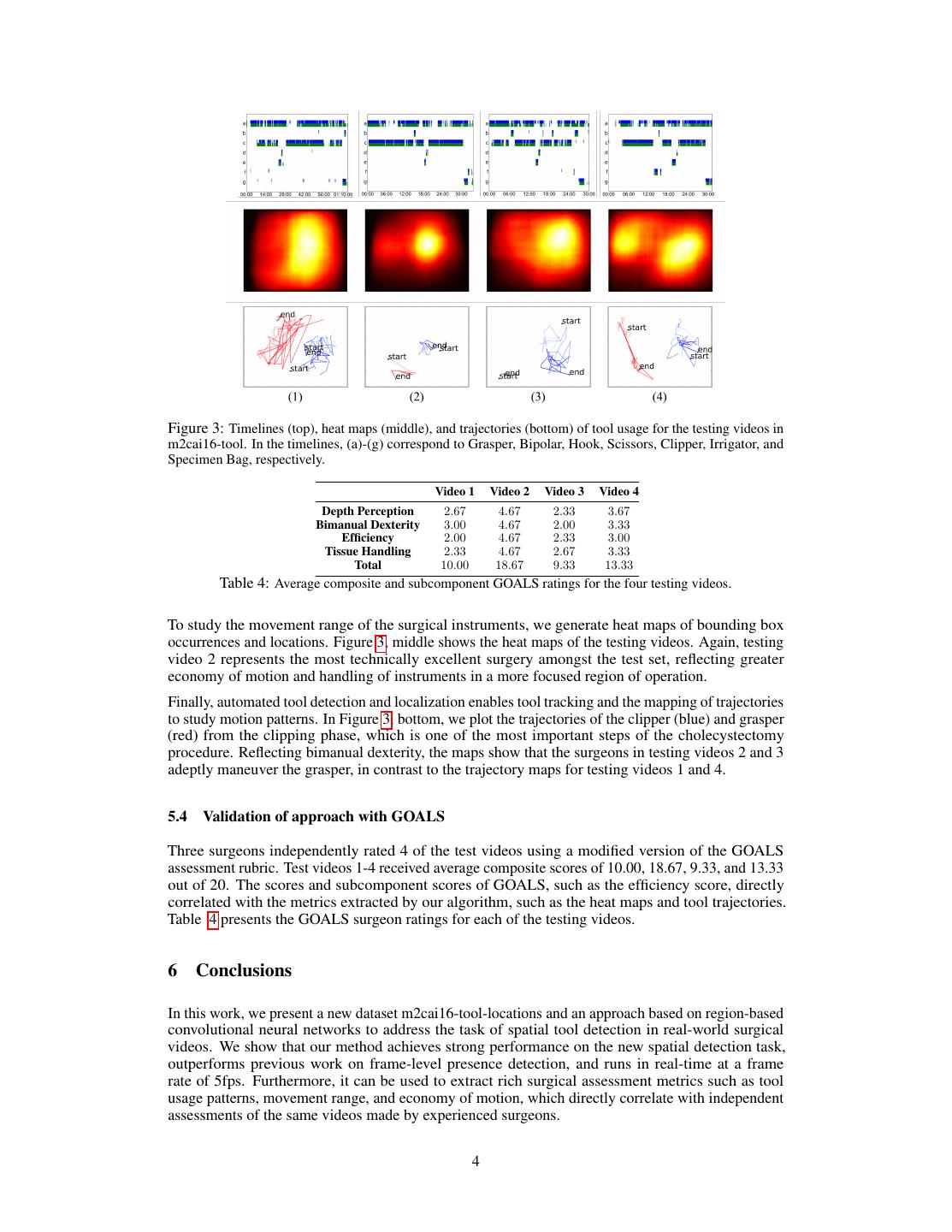 4 .Figure 3: Timelines (top), heat maps (middle), and trajectories (bottom) of tool usage for the testing videos in m2cai16-tool. In the timelines, (a)-(g) correspond to Grasper, Bipolar, Hook, Scissors, Clipper, Irrigator, and Specimen Bag, respectively. Video 1 Video 2 Video 3 Video 4 Depth Perception 2.67 4.67 2.33 3.67 Bimanual Dexterity 3.00 4.67 2.00 3.33 Efficiency 2.00 4.67 2.33 3.00 Tissue Handling 2.33 4.67 2.67 3.33 Total 10.00 18.67 9.33 13.33 Table 4: Average composite and subcomponent GOALS ratings for the four testing videos. To study the movement range of the surgical instruments, we generate heat maps of bounding box occurrences and locations. Figure 3, middle shows the heat maps of the testing videos. Again, testing video 2 represents the most technically excellent surgery amongst the test set, reflecting greater economy of motion and handling of instruments in a more focused region of operation. Finally, automated tool detection and localization enables tool tracking and the mapping of trajectories to study motion patterns. In Figure 3, bottom, we plot the trajectories of the clipper (blue) and grasper (red) from the clipping phase, which is one of the most important steps of the cholecystectomy procedure. Reflecting bimanual dexterity, the maps show that the surgeons in testing videos 2 and 3 adeptly maneuver the grasper, in contrast to the trajectory maps for testing videos 1 and 4. 5.4 Validation of approach with GOALS Three surgeons independently rated 4 of the test videos using a modified version of the GOALS assessment rubric. Test videos 1-4 received average composite scores of 10.00, 18.67, 9.33, and 13.33 out of 20. The scores and subcomponent scores of GOALS, such as the efficiency score, directly correlated with the metrics extracted by our algorithm, such as the heat maps and tool trajectories. Table 4 presents the GOALS surgeon ratings for each of the testing videos. 6 Conclusions In this work, we present a new dataset m2cai16-tool-locations and an approach based on region-based convolutional neural networks to address the task of spatial tool detection in real-world surgical videos. We show that our method achieves strong performance on the new spatial detection task, outperforms previous work on frame-level presence detection, and runs in real-time at a frame rate of 5fps. Furthermore, it can be used to extract rich surgical assessment metrics such as tool usage patterns, movement range, and economy of motion, which directly correlate with independent assessments of the same videos made by experienced surgeons. 4