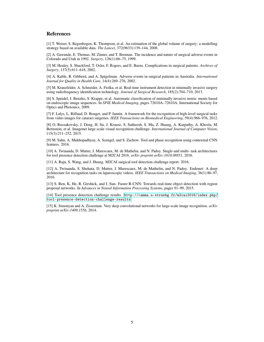 5 .References [1] T. Weiser, S. Regenbogen, K. Thompson, et al. An estimation of the global volume of surgery: a modelling strategy based on available data. The Lancet, 372(9633):139–144, 2008. [2] A. Gawande, E. Thomas, M. Zinner, and T. Brennan. The incidence and nature of surgical adverse events in Colorado and Utah in 1992. Surgery, 126(1):66–75, 1999. [3] M. Healey, S. Shackford, T. Osler, F. Rogers, and E. Burns. Complications in surgical patients. Archives of Surgery, 137(5):611–618, 2002. [4] A. Kable, R. Gibberd, and A. Spigelman. Adverse events in surgical patients in Australia. International Journal for Quality in Health Care, 14(4):269–276, 2002. [5] M. Kranzfelder, A. Schneider, A. Fiolka, et al. Real-time instrument detection in minimally invasive surgery using radiofrequency identification technology. Journal of Surgical Research, 185(2):704–710, 2013. [6] S. Speidel, J. Benzko, S. Krappe, et al. Automatic classification of minimally invasive instru- ments based on endoscopic image sequences. In SPIE Medical Imaging, pages 72610A–72610A. International Society for Optics and Photonics, 2009. [7] F. Lalys, L. Riffaud, D. Bouget, and P. Jannin. A framework for the recognition of high-level surgical tasks from video images for cataract surgeries. IEEE Transactions on Biomedical Engineering, 59(4):966–976, 2012. [8] O. Russakovsky, J. Deng, H. Su, J. Krause, S. Satheesh, S. Ma, Z. Huang, A. Karpathy, A. Khosla, M. Bernstein, et al. Imagenet large scale visual recognition challenge. International Journal of Computer Vision, 115(3):211–252, 2015. [9] M. Sahu, A. Mukhopadhyay, A. Szengel, and S. Zachow. Tool and phase recognition using contextual CNN features. 2016. [10] A. Twinanda, D. Mutter, J. Marescaux, M. de Mathelin, and N. Padoy. Single-and multi- task architectures for tool presence detection challenge at M2CAI 2016. arXiv preprint arXiv:1610.08851, 2016. [11] A. Raju, S. Wang, and J. Huang. M2CAI surgical tool detection challenge report. 2016. [12] A. Twinanda, S. Shehata, D. Mutter, J. Marescaux, M. de Mathelin, and N. Padoy. Endonet: A deep architecture for recognition tasks on laparoscopic videos. IEEE Transactions on Medical Imaging, 36(1):86–97, 2016. [13] S. Ren, K. He, R. Girshick, and J. Sun. Faster R-CNN: Towards real-time object detection with region proposal networks. In Advances in Neural Information Processing Systems, pages 91–99, 2015. [14] Tool presence detection challenge results. http://camma.u-strasbg.fr/m2cai2016/index.php/ tool-presence-detection-challenge-results. [15] K. Simonyan and A. Zisserman. Very deep convolutional networks for large-scale image recognition. arXiv preprint arXiv:1409.1556, 2014. 5
