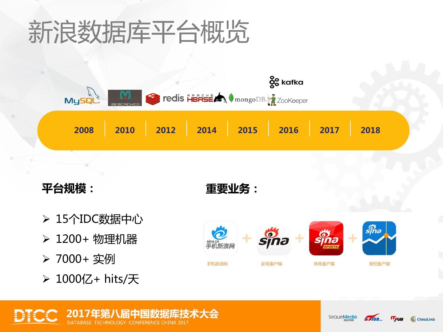 5 .新浪数据库平台概览 2008 2010 2012 2014 2015 2016 2017 2018 平台规模: 重要业务: 15个IDC数据中心 1200+ 物理机器 7000+ 实例 1000亿+ hits/天