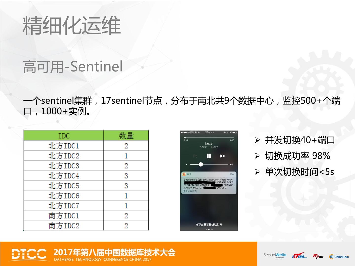 10 .精细化运维 高可用-Sentinel 一个sentinel集群,17sentinel节点,分布于南北共9个数据中心,监控500+个端 口,1000+实例。 并发切换40+端口 切换成功率 98% 单次切换时间<5s
