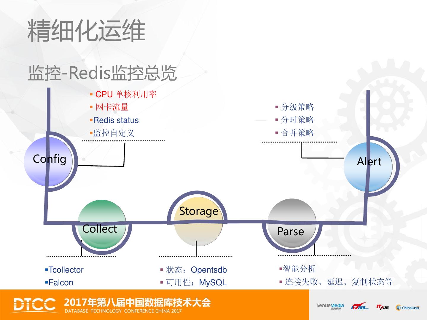 12 .精细化运维 监控-Redis监控总览 CPU 单核利用率 网卡流量 分级策略 Redis status 分时策略 监控自定义 合并策略 Config Alert Storage Collect Parse Tcollector 状态:Opentsdb 智能分析 Falcon 可用性:MySQL 连接失败、延迟、复制状态等