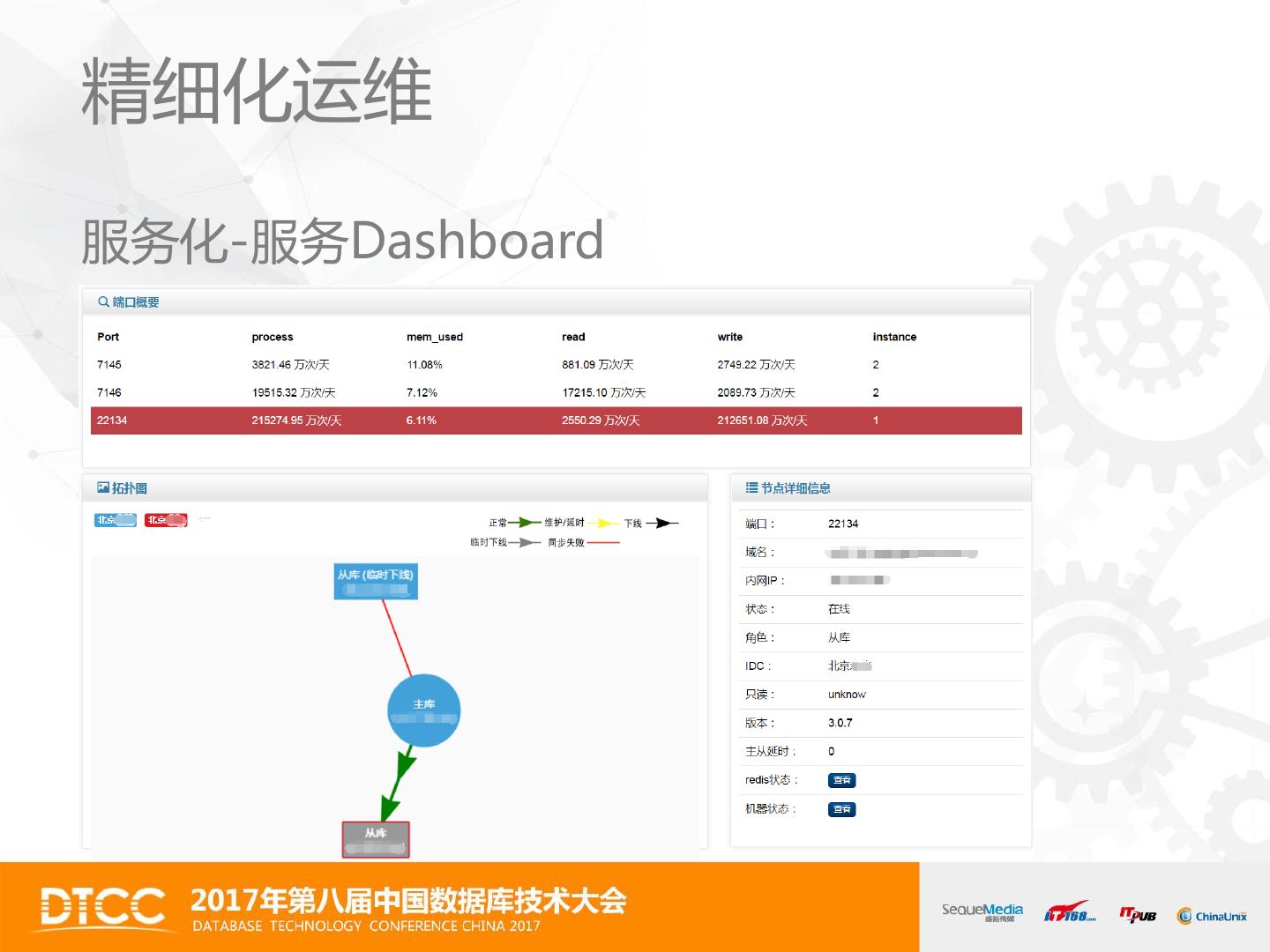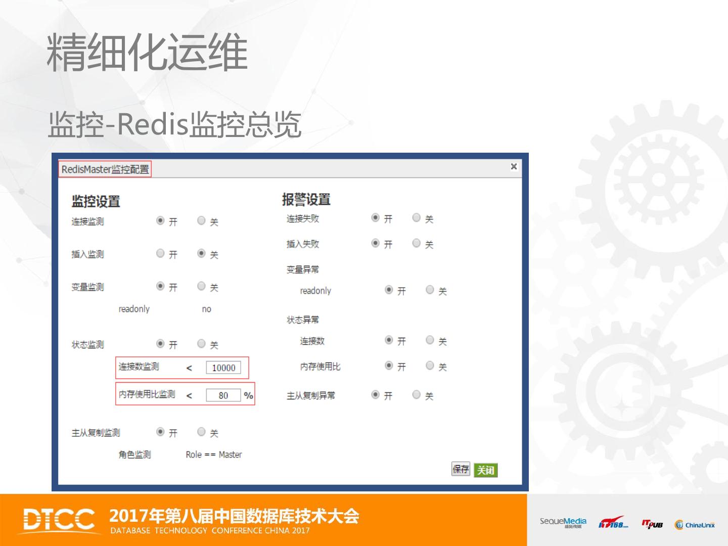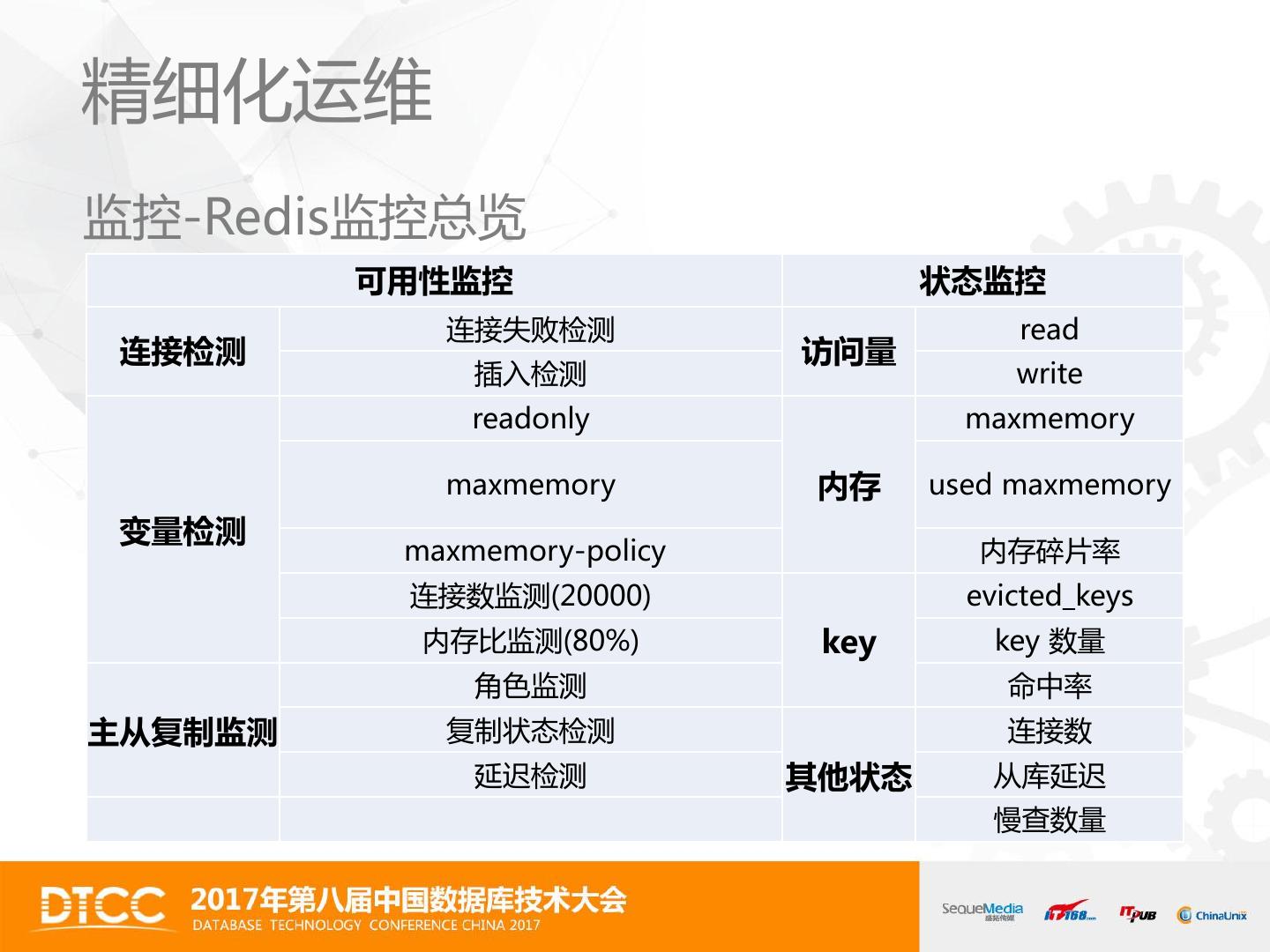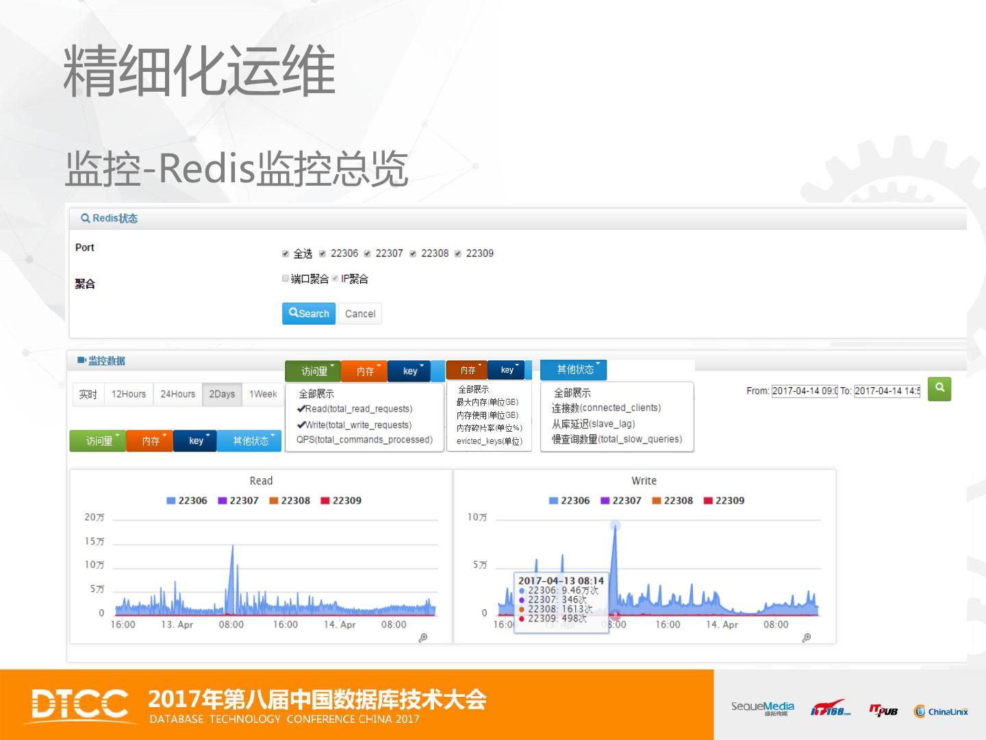 13 .精细化运维 监控-Redis监控总览 可用性监控 状态监控 连接失败检测 read 连接检测 访问量 插入检测 write readonly maxmemory maxmemory 内存 used maxmemory 变量检测 maxmemory-policy 内存碎片率 连接数监测(20000) evicted_keys 内存比监测(80%) key key 数量 角色监测 命中率 主从复制监测 复制状态检测 连接数 延迟检测 其他状态 从库延迟 慢查数量