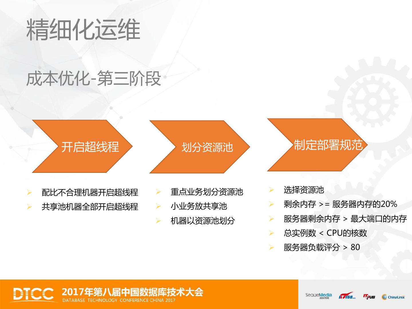24 .精细化运维 成本优化-第三阶段 开启超线程 W 划分资源池 制定部署规范 配比不合理机器开启超线程 重点业务划分资源池 选择资源池 共享池机器全部开启超线程 小业务放共享池 剩余内存 >= 服务器内存的20% 机器以资源池划分 服务器剩余内存 > 最大端口的内存 总实例数 < CPU的核数 服务器负载评分 > 80