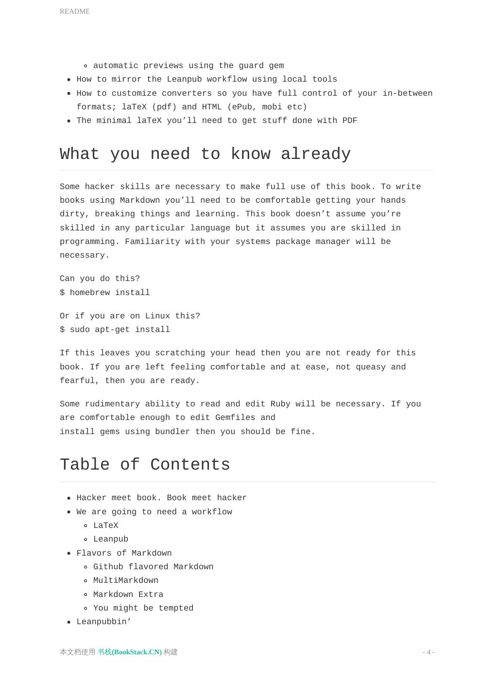 4 .README automatic previews using the guard gem How to mirror the Leanpub workflow using local tools How to customize converters so you have full control of your in-between formats; laTeX (pdf) and HTML (ePub, mobi etc) The minimal laTeX you’ll need to get stuff done with PDF What you need to know already Some hacker skills are necessary to make full use of this book. To write books using Markdown you’ll need to be comfortable getting your hands dirty, breaking things and learning. This book doesn’t assume you’re skilled in any particular language but it assumes you are skilled in programming. Familiarity with your systems package manager will be necessary. Can you do this? $ homebrew install Or if you are on Linux this? $ sudo apt-get install If this leaves you scratching your head then you are not ready for this book. If you are left feeling comfortable and at ease, not queasy and fearful, then you are ready. Some rudimentary ability to read and edit Ruby will be necessary. If you are comfortable enough to edit Gemfiles and install gems using bundler then you should be fine. Table of Contents Hacker meet book. Book meet hacker We are going to need a workflow LaTeX Leanpub Flavors of Markdown Github flavored Markdown MultiMarkdown Markdown Extra You might be tempted Leanpubbin’ 本文档使用 书栈(BookStack.CN) 构建 - 4 -