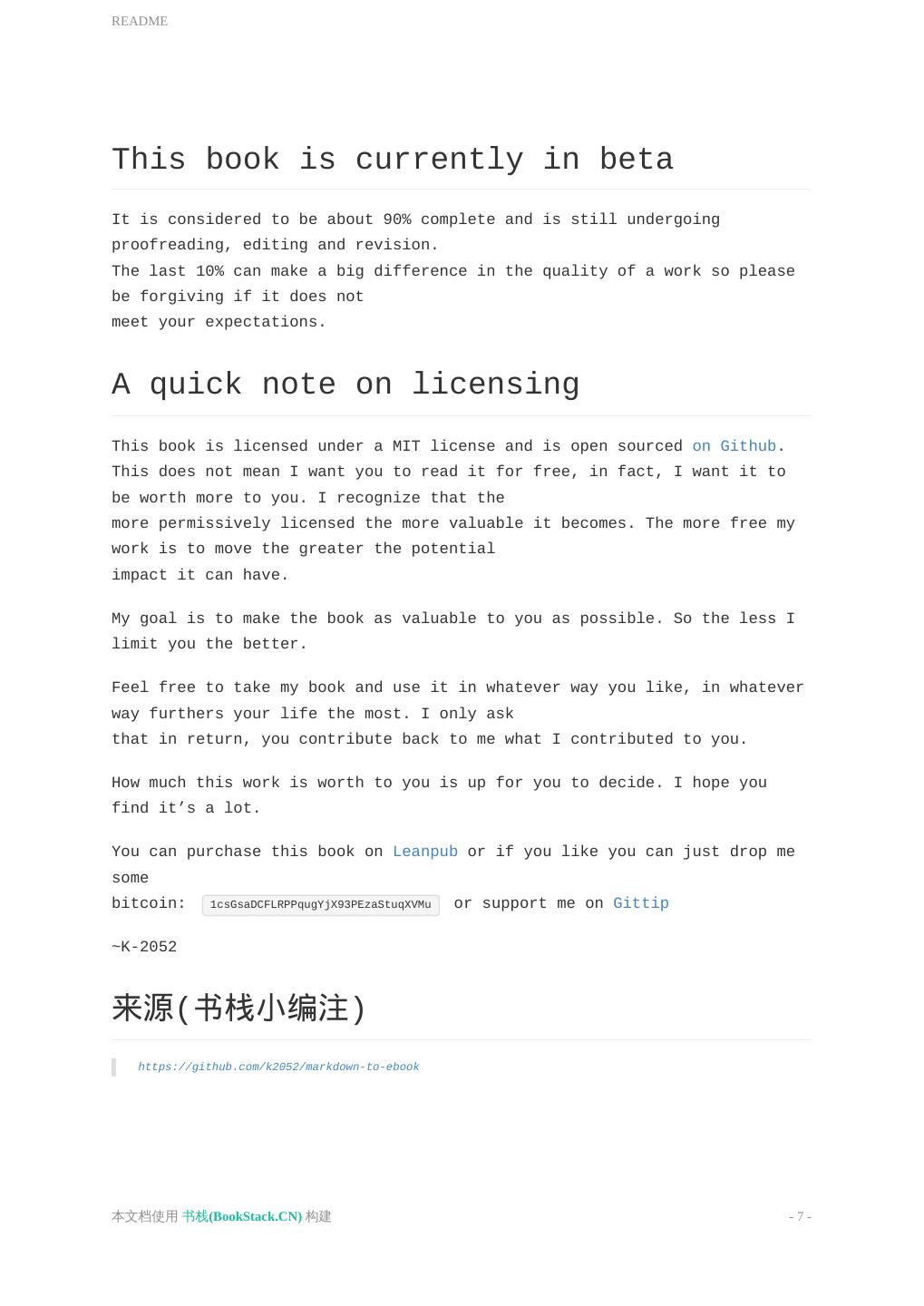 7 .README This book is currently in beta It is considered to be about 90% complete and is still undergoing proofreading, editing and revision. The last 10% can make a big difference in the quality of a work so please be forgiving if it does not meet your expectations. A quick note on licensing This book is licensed under a MIT license and is open sourced on Github. This does not mean I want you to read it for free, in fact, I want it to be worth more to you. I recognize that the more permissively licensed the more valuable it becomes. The more free my work is to move the greater the potential impact it can have. My goal is to make the book as valuable to you as possible. So the less I limit you the better. Feel free to take my book and use it in whatever way you like, in whatever way furthers your life the most. I only ask that in return, you contribute back to me what I contributed to you. How much this work is worth to you is up for you to decide. I hope you find it’s a lot. You can purchase this book on Leanpub or if you like you can just drop me some bitcoin: 1csGsaDCFLRPPqugYjX93PEzaStuqXVMu or support me on Gittip ~K-2052 来源(书栈小编注) https://github.com/k2052/markdown-to-ebook 本文档使用 书栈(BookStack.CN) 构建 - 7 -