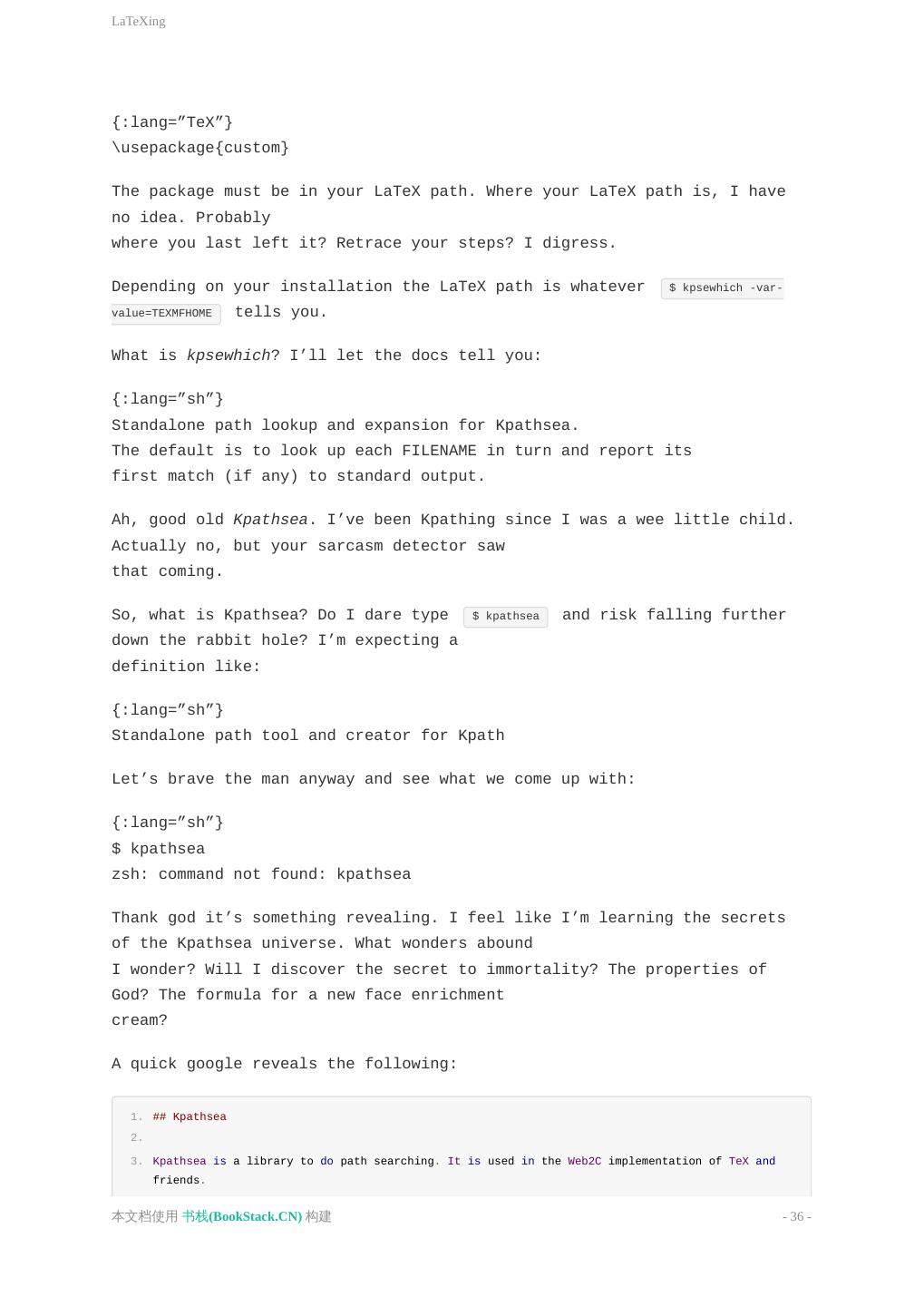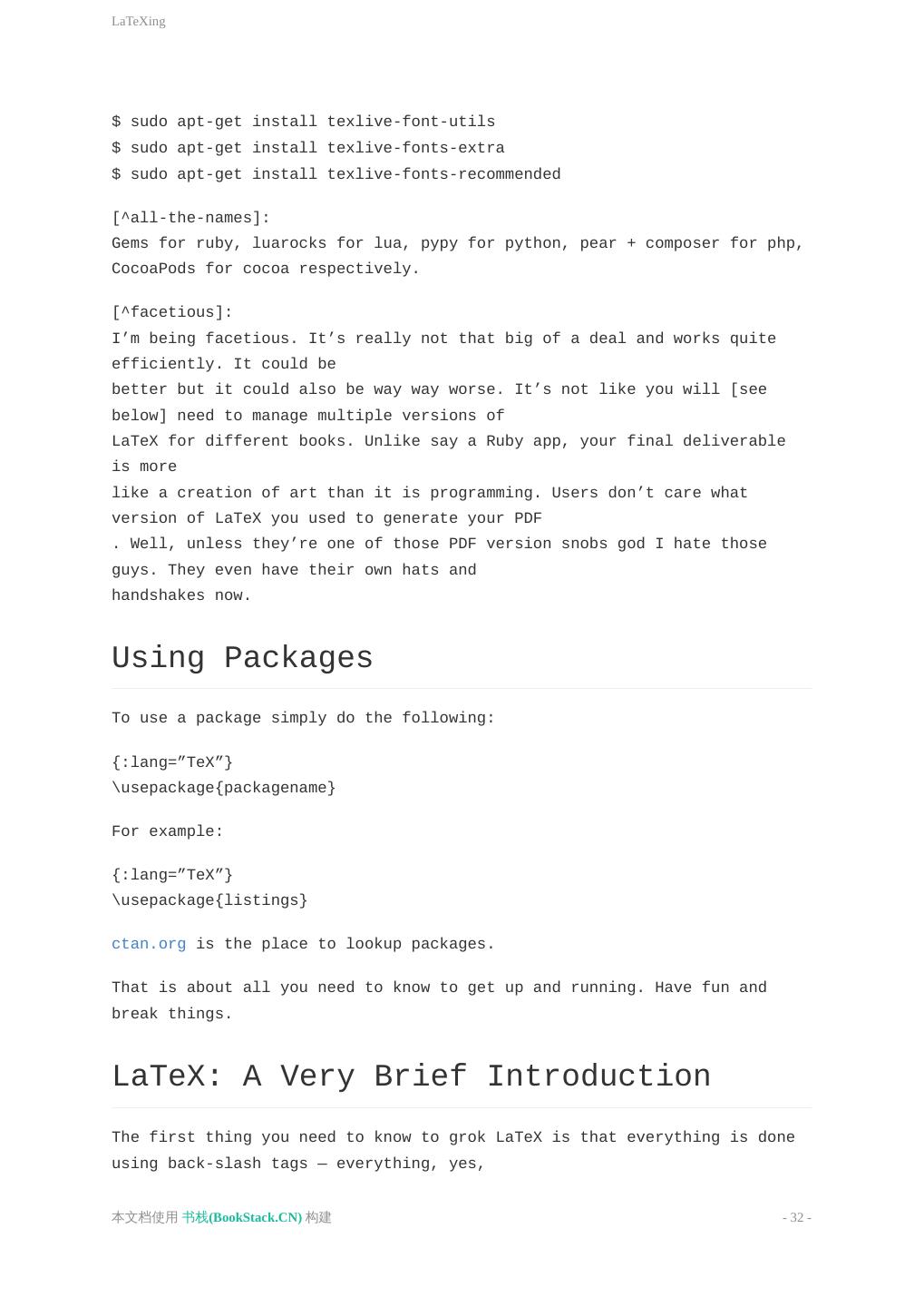 28 .LaTeXing LaTeXing LaTeXing Installing LaTeX On Mac On Ubuntu (and other Debians) Installing LaTeX Packages on Mac Installing LaTeX Packages on Ubuntu (and other Debians) Using Packages LaTeX: A Very Brief Introduction Custom LaTeX Styles LaTeXing It’s no good being tied completely to Leanpub for publishing. Eventually we will want someway to locally generate all the formats that Leanpub does. We have already covered generating HTML locally, but what about PDFs? Kramdown doesn’t support PDFs natively, it uses an in-between format called LaTeX. So before we get started on converting Markdown to PDFs we are going to have to learn some LaTeX. LaTeX knowledge is not strictly necessary but it’s going to be beneficial to know how the magic works. Magic is great and makes things easier, but when it fails, and you don’t know how it works, frustration finds its way into your soul. Frustration kills the desire to create and will leave you a sad, bleeding, heaving mess on the floor. Probably not that graphic, but it’s terrible, trust me. Let’s avoid some future frustration and learn a little LaTeX. Installing LaTeX Before you dive in there are some things you need to know. The LaTeX community is a bit bloated. Well, maybe “a bit” is an understatement, LaTeX makes Photoshop seem like an anorexic. This bloat is the result of the community being really old in software years — TeX is older than I am. As a result of its 本文档使用 书栈(BookStack.CN) 构建 - 28 -