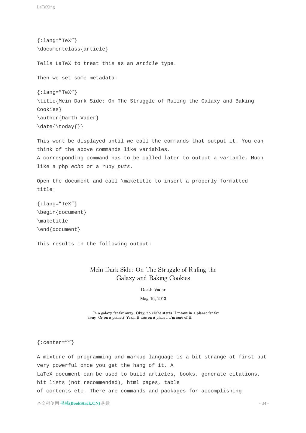 14 .We are going to need a workflow Where will we distribute the book? For distribution it would be nice to have something that works well for the writing phase as well as the publishing phase. Perhaps even something that generates our ebooks from our source formats for us. Such a service exists and it’s called Leanpub. What does Leanpub use as its source format? Leanpub uses Markdown. Thus, we will need to use Markdown; we now have our first constraint. What final format does it need to be in when distributed? There are a zillion different options for ebook formats so whatever we choose it’s going to have to be capable of converting into a variety of formats. We will need something that can go into PDF, epub, kindle and mobi formats. It just so happens that with the exception of PDF all these formats are HTML at there core. What is a good option for writing HTML ebooks? Markdown of course. Markdown is simple, flexible, looks great as plaintext and most importantly, it is built with HTML as the intended output format. How then do we turn Markdown into PDFs? The answer lies in LaTeX, which will be our in-between format of choice. LaTeX is to PDF as Markdown is to HTML. They’re best buds and get together all the time to just chat and mark things up. Does LaTeX mean we will have to maintain two separate formats? Nope. Markdown can be easily converted into LaTeX using tools like Kramdown. LaTeX LaTeX is one of those things you probably know about but have never bothered learning. I mean, it’s for technical 本文档使用 书栈(BookStack.CN) 构建 - 14 -