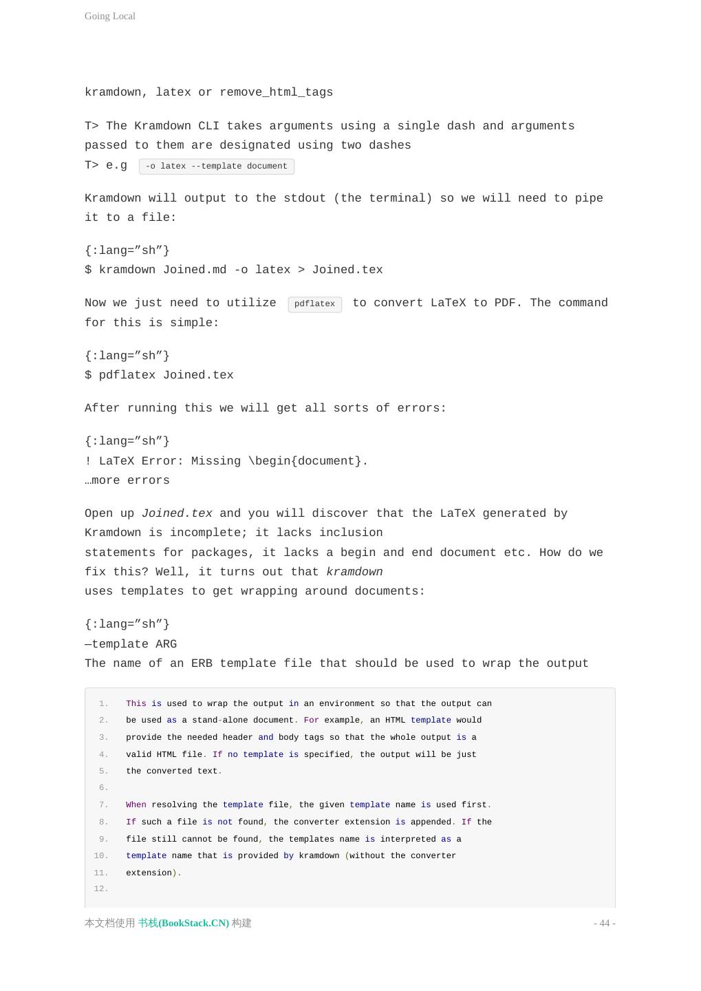 11 .An Introduction processes. It’s a book for those that like to learn something. The only way to eliminate frustration is to internalize your knowledge, to make it so much a part of you that it cant be ignored. Unless you truly know how to do something then doing it is going to get in the way and take energy away from your writing. You cant for instance, be looking up how to create a section every time you want to create a section. Such a workflow will kill a book before it is even start. Things have to flow smoothly, without thought, so you can just write. With this in mind, I have kept the approach to tools as simple as possible, so they can be internalized as quickly as possible. Our book’ source files will be written in Markdown. Markdown is simple enough to internalize in a day and most importantly, it is flexible enough that it can be adapted to support a variety of extras. Kramdown has been chosen as our flavor/implementation of Markdown. This is for a few reasons; 1. It is used in a variety of publishing platforms (specifically Leanpub) 2. It closely resembles many other implementations like PHP Markdown Extended. 3. It’s well documented. 4. It’s coded in Ruby. Tools like pandoc are just as powerful as Kramdown but pandoc is unfortunately written in Haskell. Haskell would only increase the learning curve and add more annoying parts to getting our ebook published. What you need to know You wont need to know much to get through this book but you will need to be comfortable hacking around. Comfortable is a dangerous word for communication, one’s interpretation can vary greatly from what is intended. Let’s go over some examples to help clarify what I mean by comfortable Can you do this? {:lang=”sh”} 本文档使用 书栈(BookStack.CN) 构建 - 11 -