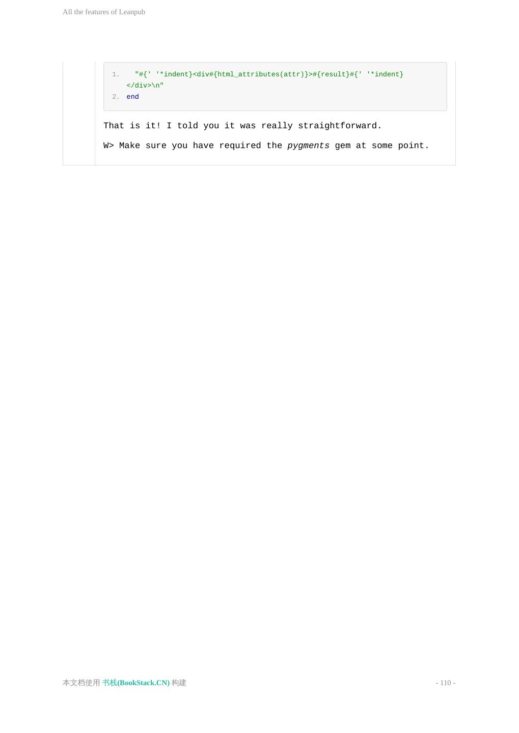 20 .Flavors of Markdown Since you cant modify the parsing on Github, if you plan to publish the same Markdown on Github and need the code highlighting you’ll need to modify Kramdown to use the same indicator as Github for starting and closing fenced code blocks. A> Alternatively you can just use indentation to specify your code blocks which is compatible across most A> implementations Changing ~ to a ` will get it parsing like Github. To do that just search for FENCED_CODEBLOCK_START in the Kramdown files. Monkey-patching is the simplest way to get the modification into Kramdown. In the interest of clarity, the following code snippet will accomplish said changes: {.lang=”ruby”} module Kramdown module Parser class Kramdown FENCED_CODEBLOCK_START = /^ {3,}/ FENCED_CODEBLOCK_MATCH = /^( {3,})\s?(\w+)?\s? \n(.?)^\1`\s*?\n/m end end end If you plan to use Leanpub you’ll need to utilize indented codeblocks instead. You’ll indent things using four spaces then manually specify your language using attribute lists. Like this: {:lang=”md”} This is a codeblock 1. {:lang="ruby"} 2. cats = 'demons' Beyond that, just follow the docs for Kramdown and you’ll be fine. Learn your Markdown 本文档使用 书栈(BookStack.CN) 构建 - 20 -
