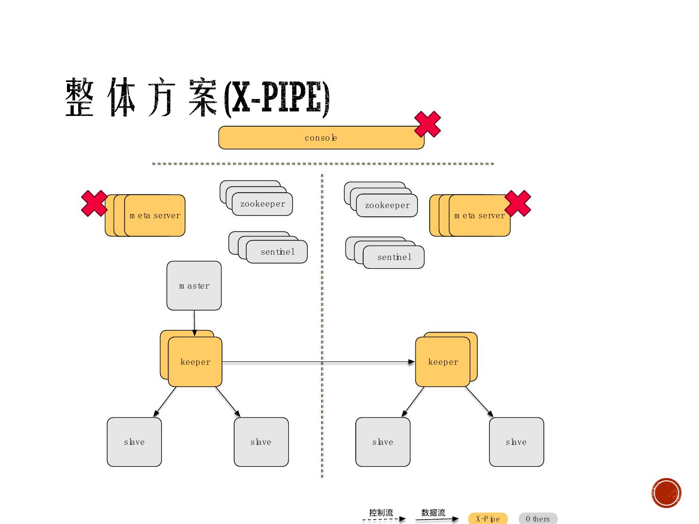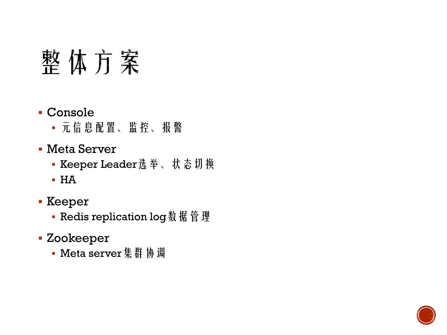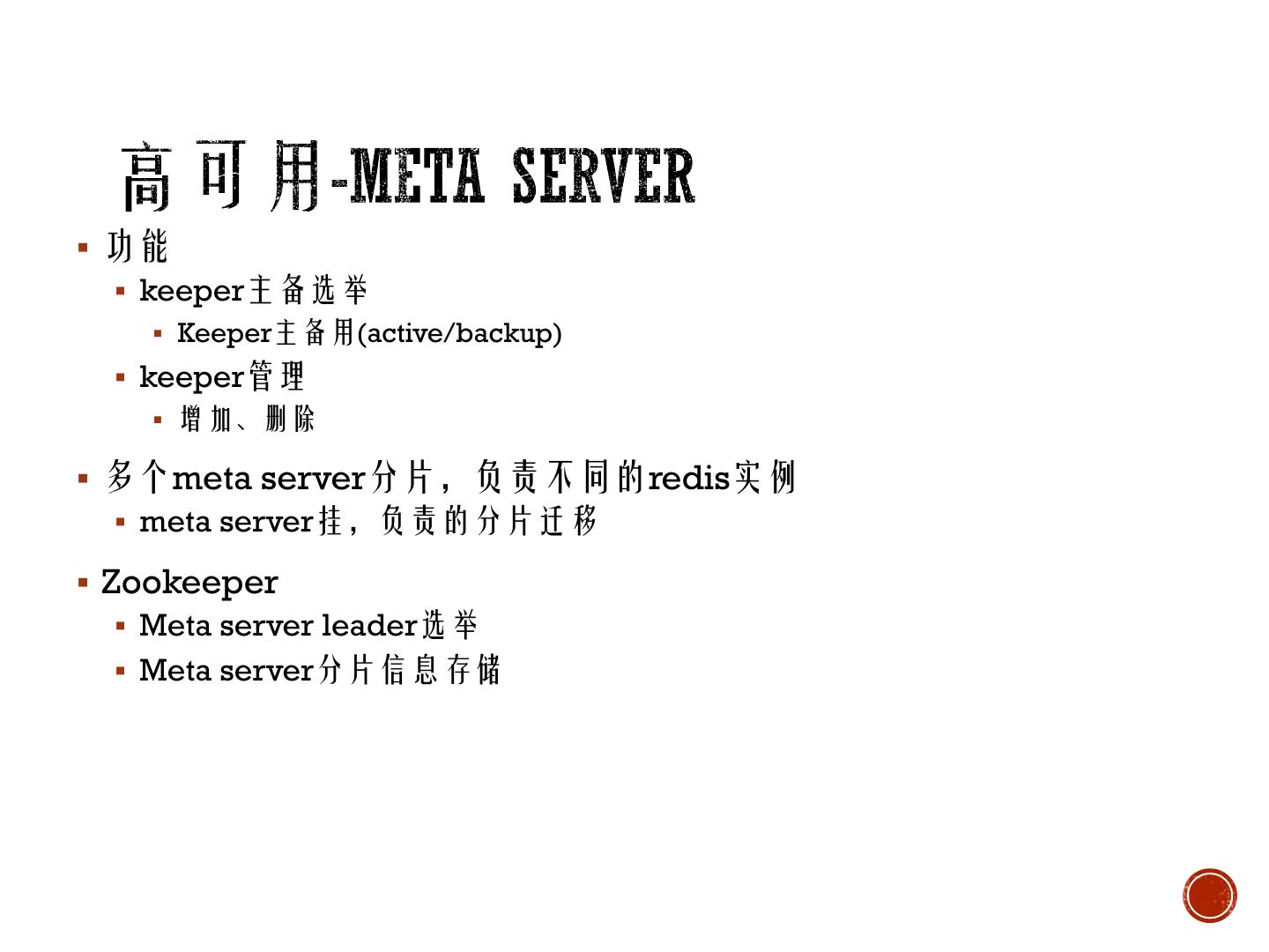 8 . Console 元信息配置、监控、报警 Meta Server Keeper Leader选举、状态切换 HA Keeper Redis replication log数据管理 Zookeeper Meta server集群协调