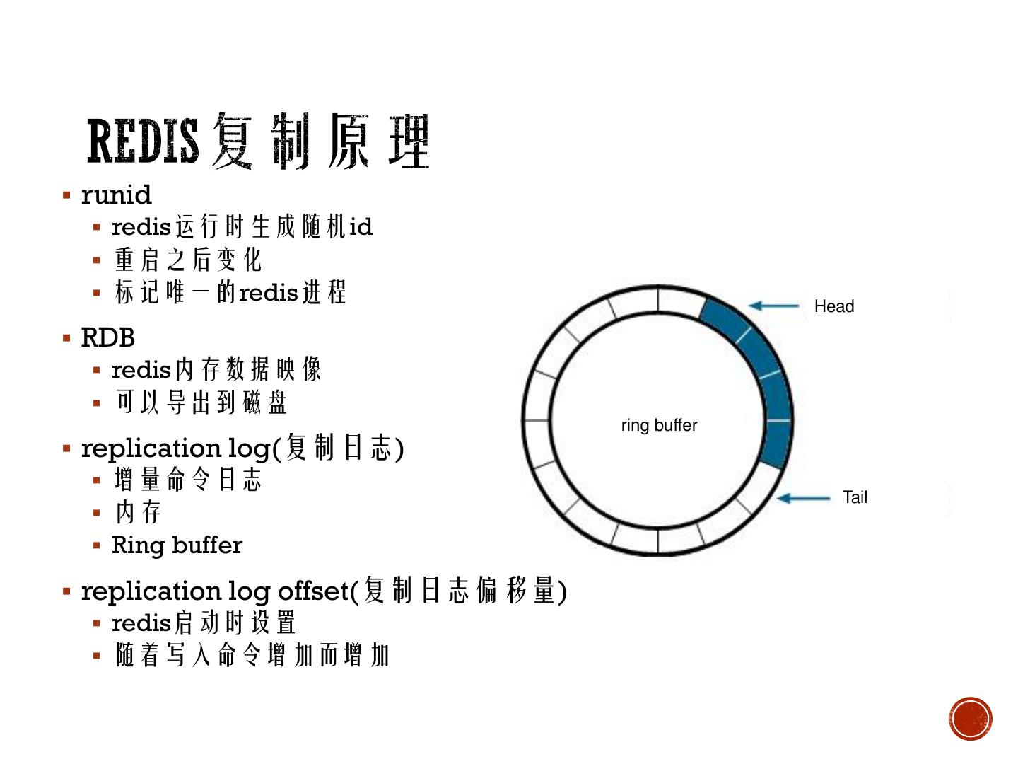 14 . runid redis运行时生成随机id 重启之后变化 标记唯一的redis进程 Head RDB redis内存数据映像 可以导出到磁盘 ring buffer replication log(复制日志) 增量命令日志 Tail 内存 Ring buffer replication log offset(复制日志偏移量) redis启动时设置 随着写入命令增加而增加