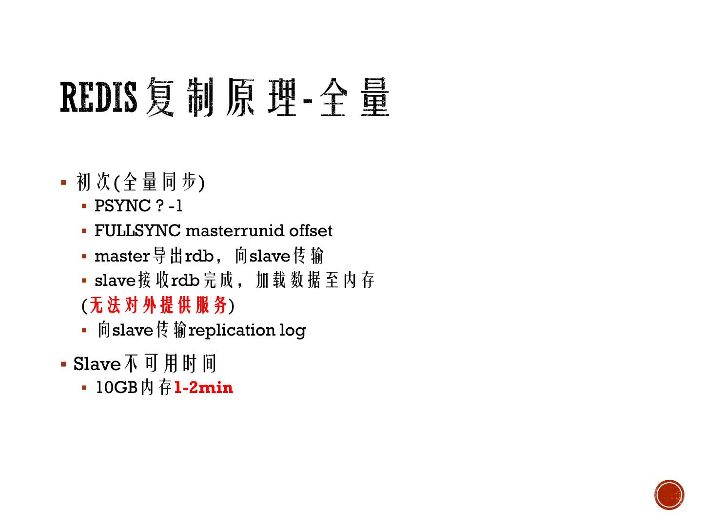 16 . 初次(全量同步) PSYNC ? -1 FULLSYNC masterrunid offset master导出rdb,向slave传输 slave接收rdb完成,加载数据至内存 (无法对外提供服务) 向slave传输replication log Slave不可用时间 10GB内存1-2min