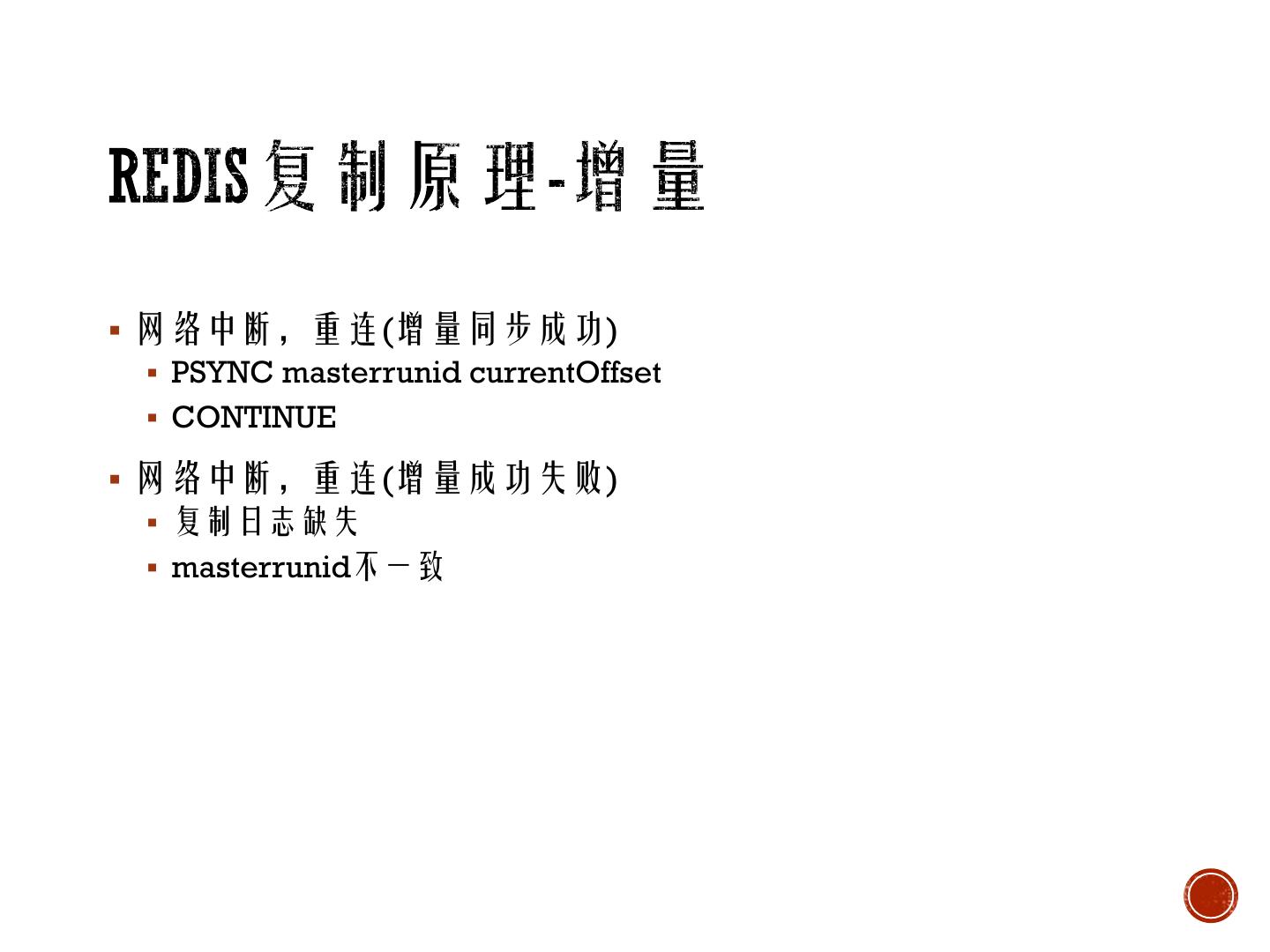 17 . 网络中断,重连(增量同步成功) PSYNC masterrunid currentOffset CONTINUE 网络中断,重连(增量成功失败) 复制日志缺失 masterrunid不一致