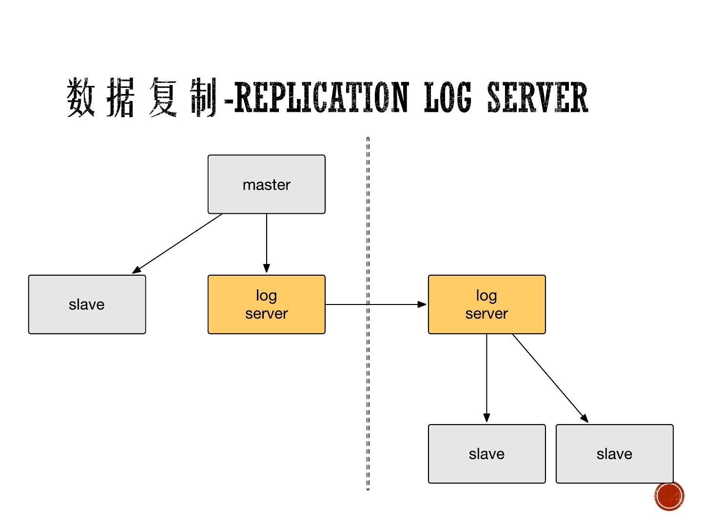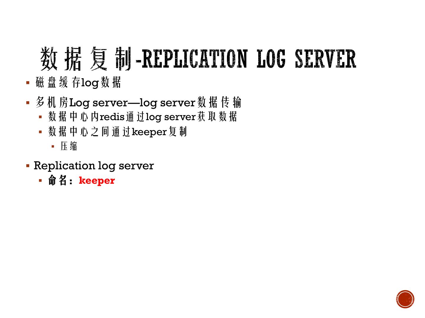 21 . 磁盘缓存log数据 多机房Log server—log server数据传输 数据中心内redis通过log server获取数据 数据中心之间通过keeper复制 压缩 Replication log server 命名:keeper