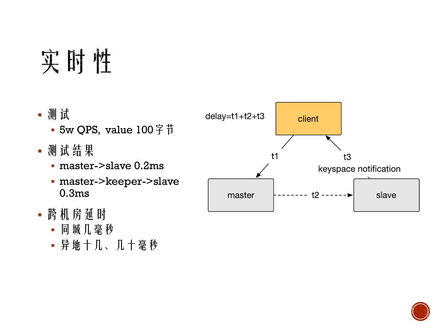 22 . 测试 5w QPS, value 100字节 测试结果 master->slave 0.2ms master->keeper->slave 0.3ms 跨机房延时 同城几毫秒 异地十几、几十毫秒