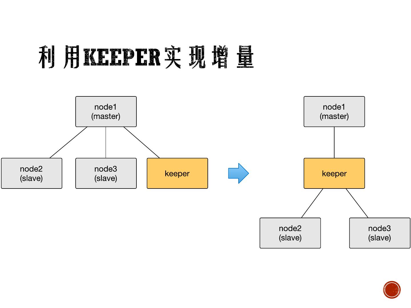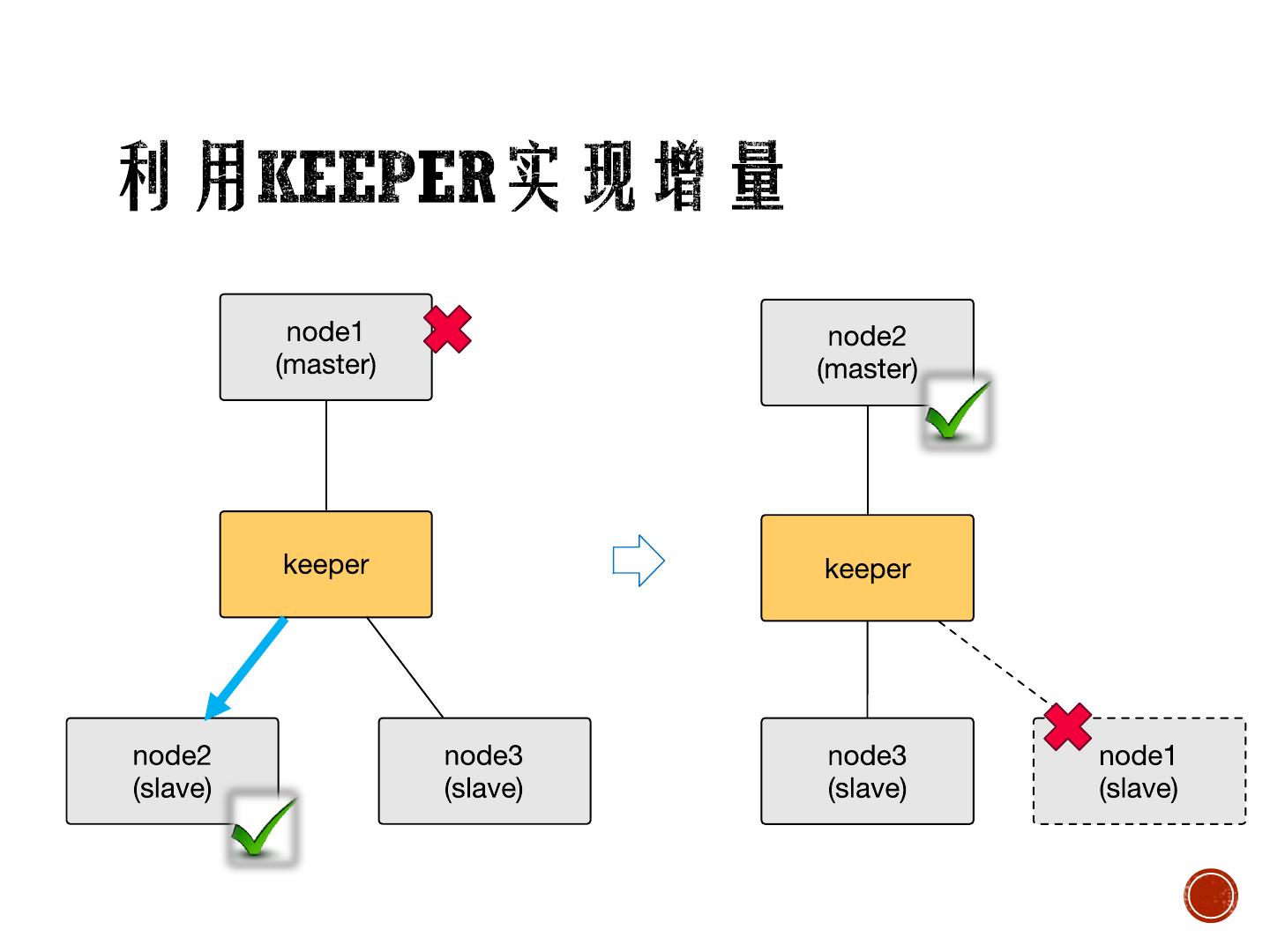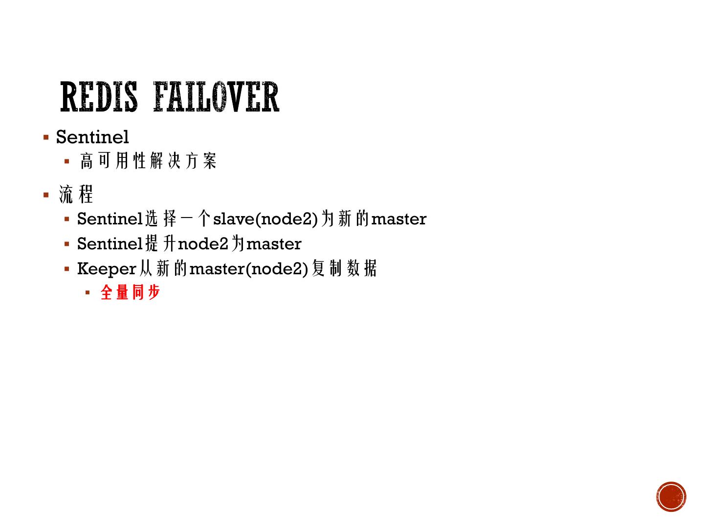 28 . Sentinel 高可用性解决方案 流程 Sentinel选择一个slave(node2)为新的master Sentinel提升node2为master Keeper从新的master(node2)复制数据 全量同步