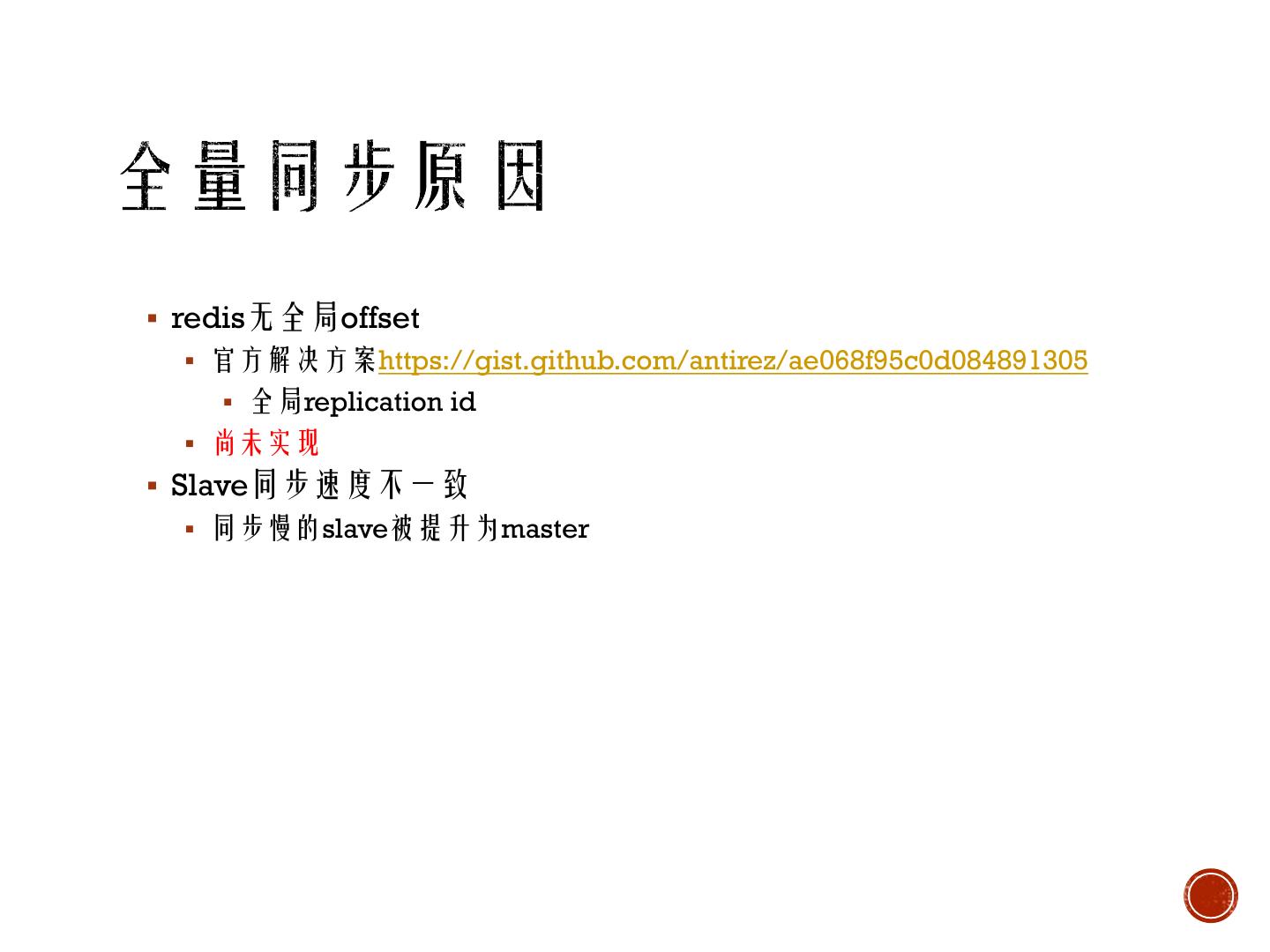 29 . redis无全局offset 官方解决方案https://gist.github.com/antirez/ae068f95c0d084891305 全局replication id 尚未实现 Slave同步速度不一致 同步慢的slave被提升为master