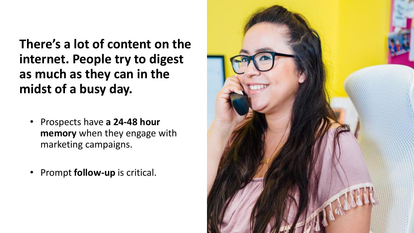 26 .There’s a lot of content on the internet. People try to digest as much as they can in the midst of a busy day. • Prospects have a 24-48 hour memory when they engage with marketing campaigns. • Prompt follow-up is critical.