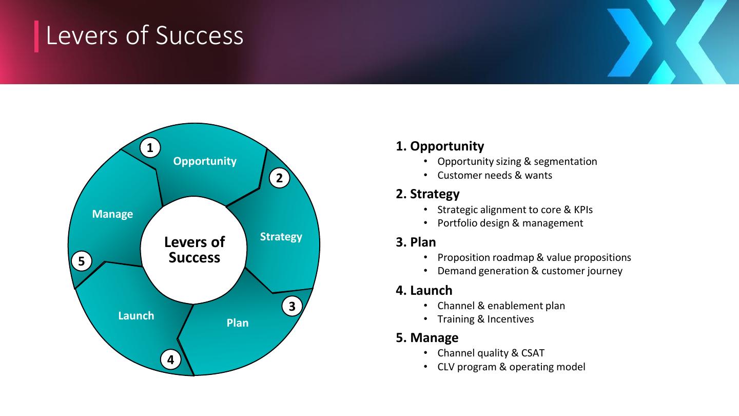 10 .Levers of Success 1 1. Opportunity Opportunity • Opportunity sizing & segmentation 2 • Customer needs & wants 2. Strategy Manage • Strategic alignment to core & KPIs • Portfolio design & management Strategy Levers of 3. Plan 5 Success • Proposition roadmap & value propositions • Demand generation & customer journey 4. Launch 3 • Channel & enablement plan Launch • Training & Incentives Plan 5. Manage • Channel quality & CSAT 4 • CLV program & operating model