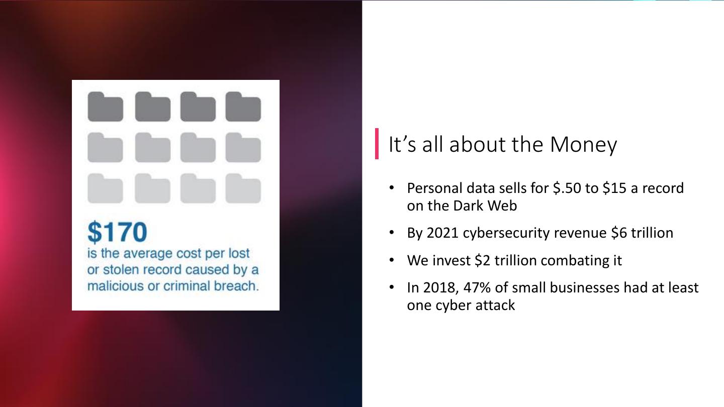 6 .It’s all about the Money • Personal data sells for $.50 to $15 a record on the Dark Web • By 2021 cybersecurity revenue $6 trillion • We invest $2 trillion combating it • In 2018, 47% of small businesses had at least one cyber attack