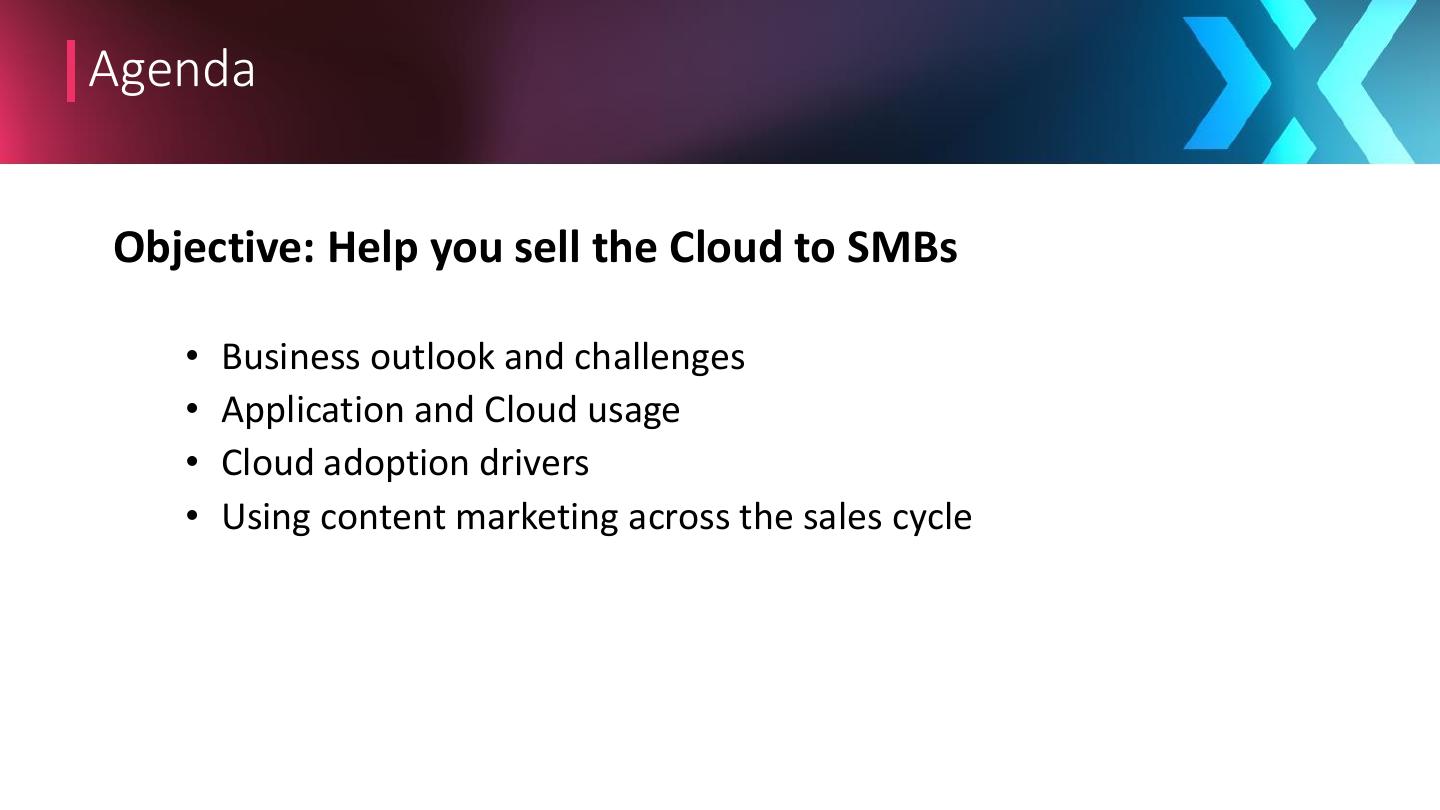 2 .Agenda Objective: Help you sell the Cloud to SMBs • Business outlook and challenges • Application and Cloud usage • Cloud adoption drivers • Using content marketing across the sales cycle