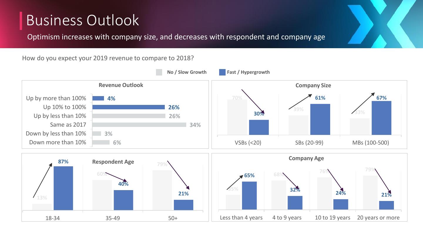 5 . Business Outlook Optimism increases with company size, and decreases with respondent and company age How do you expect your 2019 revenue to compare to 2018? No / Slow Growth Fast / Hypergrowth Revenue Outlook Company Size Up by more than 100% 4% 70% 61% 67% Up 10% to 100% 26% 39% 30% 33% Up by less than 10% 26% Same as 2017 34% Down by less than 10% 3% Down more than 10% 6% VSBs (<20) SBs (20-99) MBs (100-500) Company Age 87% Respondent Age 79% 76% 79% 60% 65% 68% 40% 35% 32% 21% 24% 21% 13% 18-34 35-49 50+ Less than 4 years 4 to 9 years 10 to 19 years 20 years or more