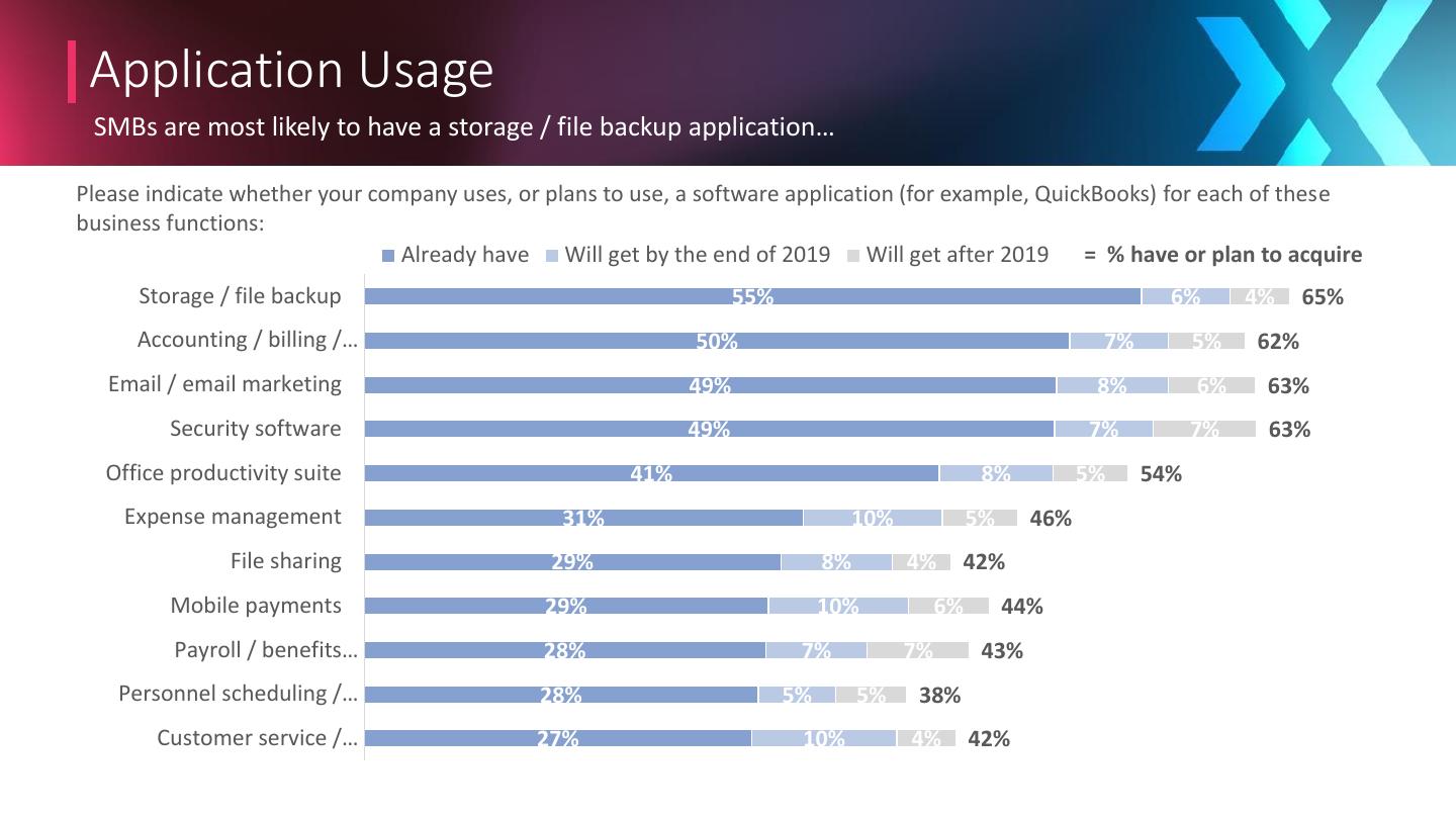 9 . Application Usage SMBs are most likely to have a storage / file backup application… Please indicate whether your company uses, or plans to use, a software application (for example, QuickBooks) for each of these business functions: Already have Will get by the end of 2019 Will get after 2019 = % have or plan to acquire Storage / file backup 55% 6% 4% 65% Accounting / billing /… 50% 7% 5% 62% Email / email marketing 49% 8% 6% 63% Security software 49% 7% 7% 63% Office productivity suite 41% 8% 5% 54% Expense management 31% 10% 5% 46% File sharing 29% 8% 4% 42% Mobile payments 29% 10% 6% 44% Payroll / benefits… 28% 7% 7% 43% Personnel scheduling /… 28% 5% 5% 38% Customer service /… 27% 10% 4% 42%