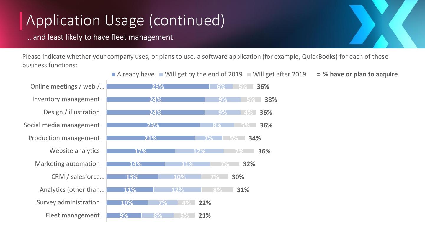 10 . Application Usage (continued) …and least likely to have fleet management Please indicate whether your company uses, or plans to use, a software application (for example, QuickBooks) for each of these business functions: Already have Will get by the end of 2019 Will get after 2019 = % have or plan to acquire Online meetings / web /… 25% 6% 5% 36% Inventory management 24% 9% 5% 38% Design / illustration 24% 9% 4% 36% Social media management 23% 8% 5% 36% Production management 21% 7% 5% 34% Website analytics 17% 12% 7% 36% Marketing automation 14% 11% 7% 32% CRM / salesforce… 13% 10% 7% 30% Analytics (other than… 11% 12% 8% 31% Survey administration 10% 7% 4% 22% Fleet management 9% 8% 5% 21%