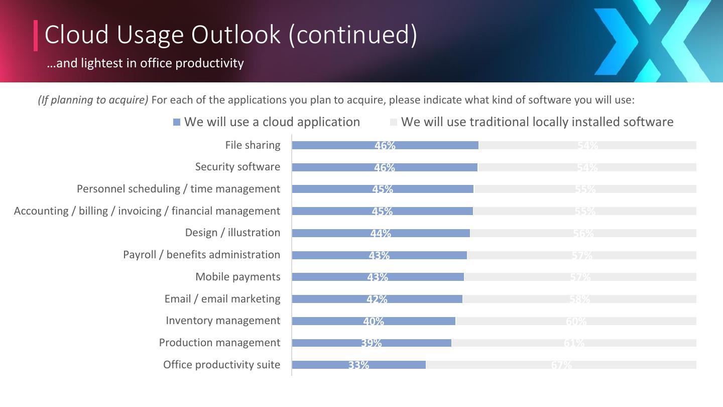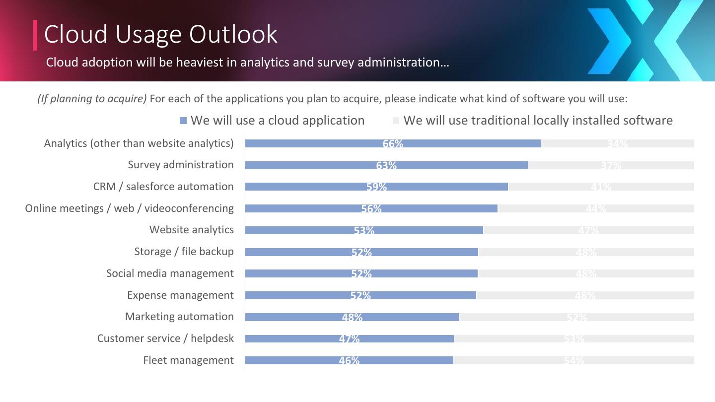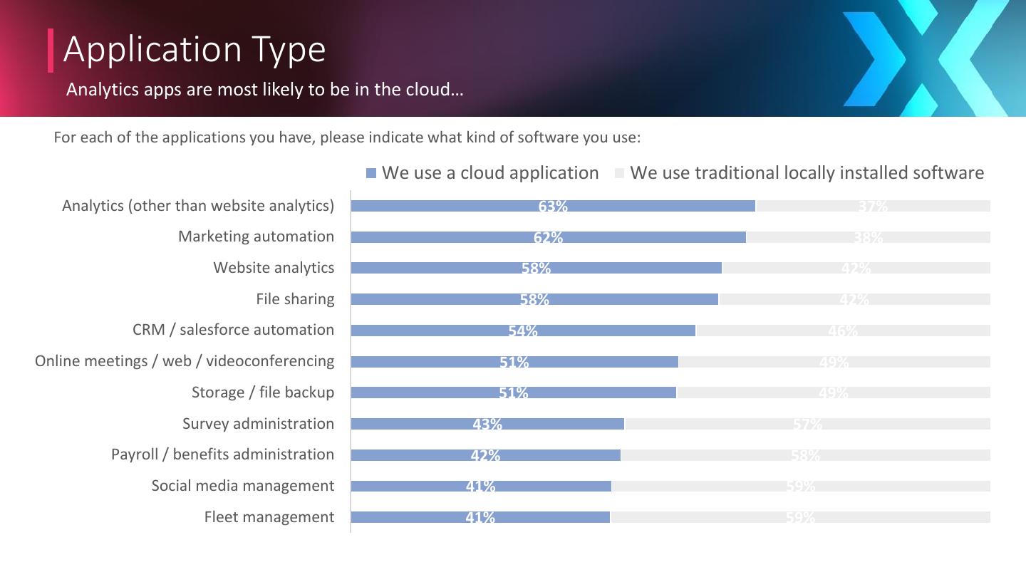 11 . Application Type Analytics apps are most likely to be in the cloud… For each of the applications you have, please indicate what kind of software you use: We use a cloud application We use traditional locally installed software Analytics (other than website analytics) 63% 37% Marketing automation 62% 38% Website analytics 58% 42% File sharing 58% 42% CRM / salesforce automation 54% 46% Online meetings / web / videoconferencing 51% 49% Storage / file backup 51% 49% Survey administration 43% 57% Payroll / benefits administration 42% 58% Social media management 41% 59% Fleet management 41% 59%