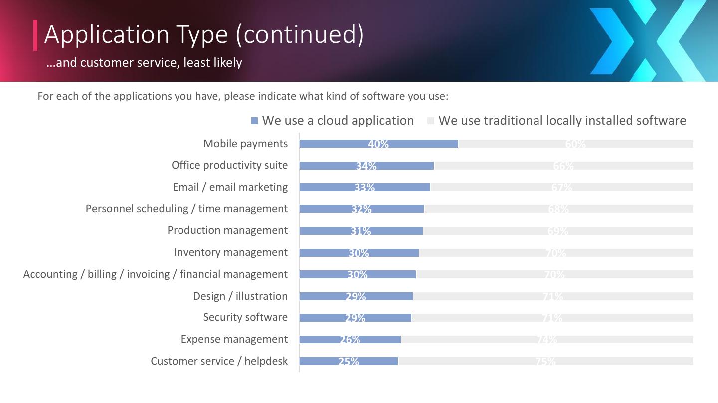 12 . Application Type (continued) …and customer service, least likely For each of the applications you have, please indicate what kind of software you use: We use a cloud application We use traditional locally installed software Mobile payments 40% 60% Office productivity suite 34% 66% Email / email marketing 33% 67% Personnel scheduling / time management 32% 68% Production management 31% 69% Inventory management 30% 70% Accounting / billing / invoicing / financial management 30% 70% Design / illustration 29% 71% Security software 29% 71% Expense management 26% 74% Customer service / helpdesk 25% 75%