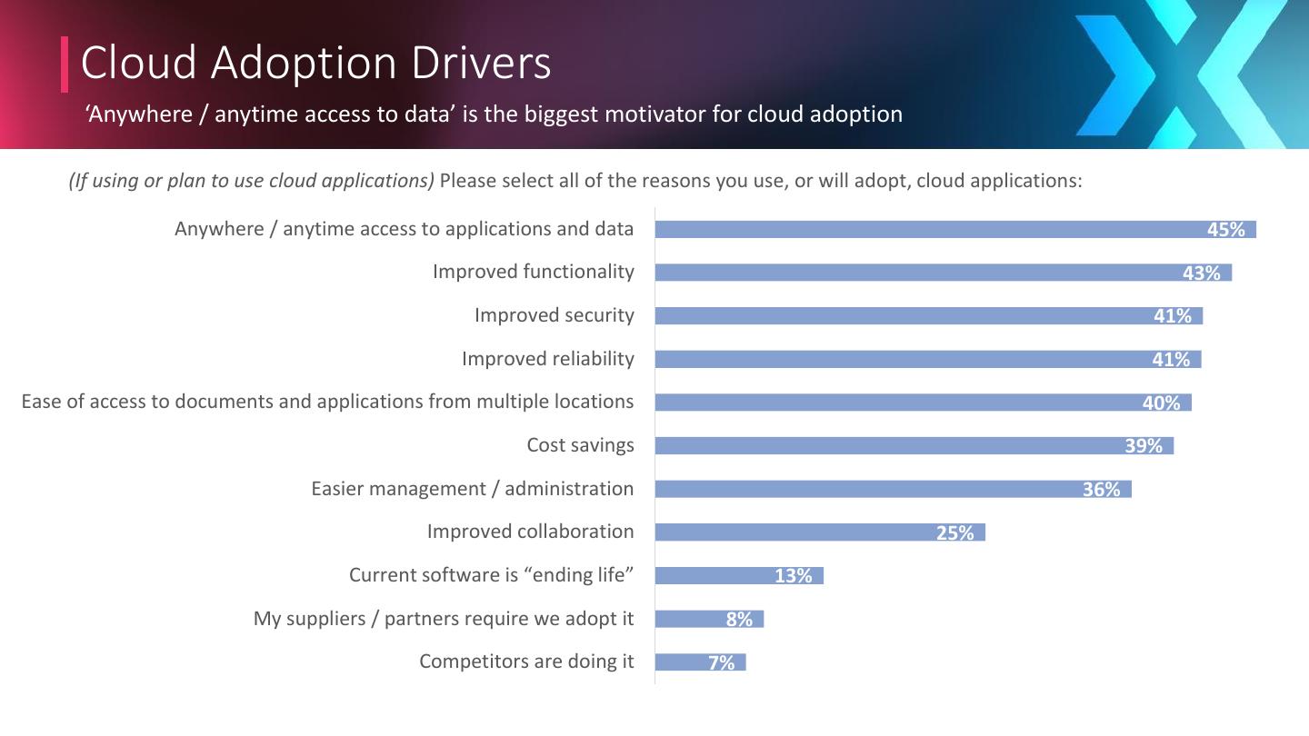 16 . Cloud Adoption Drivers ‘Anywhere / anytime access to data’ is the biggest motivator for cloud adoption (If using or plan to use cloud applications) Please select all of the reasons you use, or will adopt, cloud applications: Anywhere / anytime access to applications and data 45% Improved functionality 43% Improved security 41% Improved reliability 41% Ease of access to documents and applications from multiple locations 40% Cost savings 39% Easier management / administration 36% Improved collaboration 25% Current software is “ending life” 13% My suppliers / partners require we adopt it 8% Competitors are doing it 7%