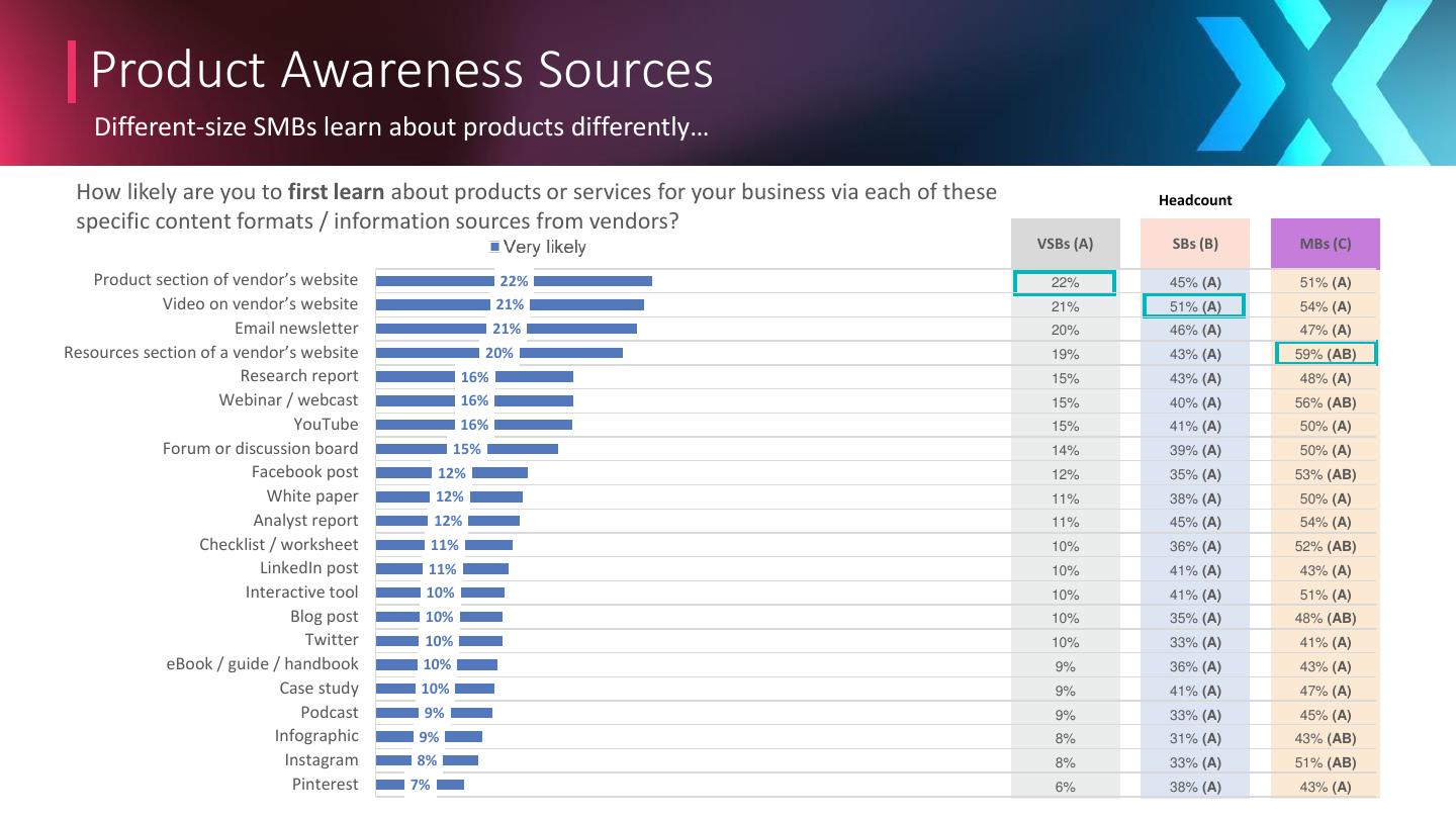 20 . Product Awareness Sources Different-size SMBs learn about products differently… How likely are you to first learn about products or services for your business via each of these Headcount specific content formats / information sources from vendors? VSBs (A) SBs (B) MBs (C) Product section of vendor’s website 22% 22% 45% (A) 51% (A) Video on vendor’s website 21% 21% 51% (A) 54% (A) Email newsletter 21% 20% 46% (A) 47% (A) Resources section of a vendor’s website 20% 19% 43% (A) 59% (AB) Research report 16% 15% 43% (A) 48% (A) Webinar / webcast 16% 15% 40% (A) 56% (AB) YouTube 16% 15% 41% (A) 50% (A) Forum or discussion board 15% 14% 39% (A) 50% (A) Facebook post 12% 12% 35% (A) 53% (AB) White paper 12% 11% 38% (A) 50% (A) Analyst report 12% 11% 45% (A) 54% (A) Checklist / worksheet 11% 10% 36% (A) 52% (AB) LinkedIn post 11% 10% 41% (A) 43% (A) Interactive tool 10% 10% 41% (A) 51% (A) Blog post 10% 10% 35% (A) 48% (AB) Twitter 10% 10% 33% (A) 41% (A) eBook / guide / handbook 10% 9% 36% (A) 43% (A) Case study 10% 9% 41% (A) 47% (A) Podcast 9% 9% 33% (A) 45% (A) Infographic 9% 8% 31% (A) 43% (AB) Instagram 8% 8% 33% (A) 51% (AB) Pinterest 7% 6% 38% (A) 43% (A)