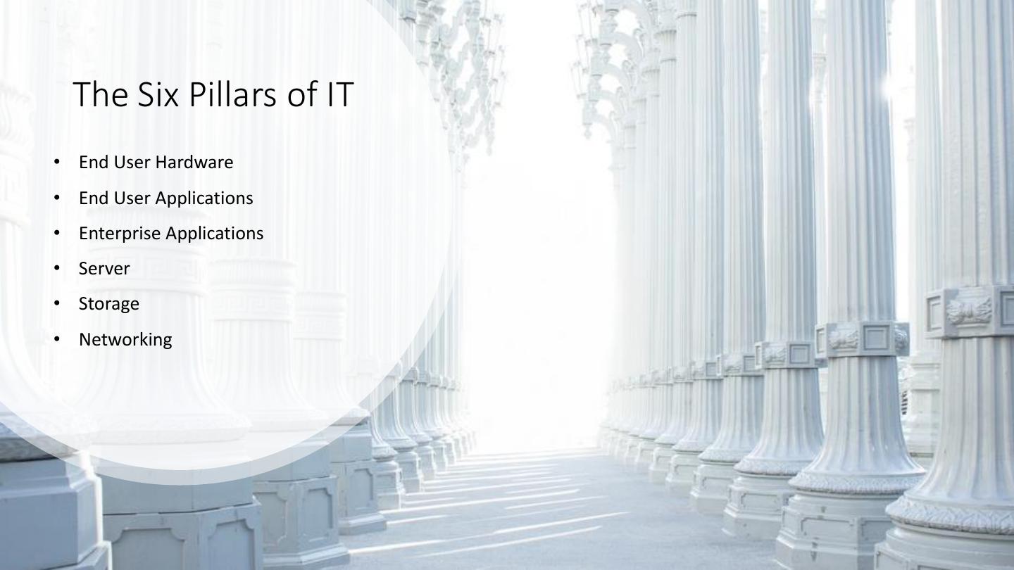 6 . The Six Pillars of IT • End User Hardware • End User Applications • Enterprise Applications • Server • Storage • Networking