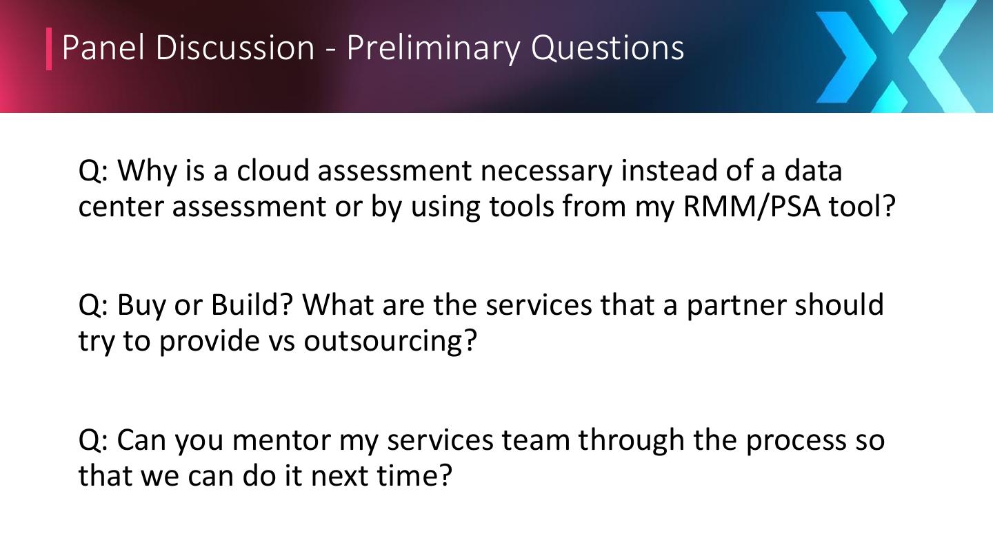 12 .Panel Discussion - Preliminary Questions Q: Why is a cloud assessment necessary instead of a data center assessment or by using tools from my RMM/PSA tool? Q: Buy or Build? What are the services that a partner should try to provide vs outsourcing? Q: Can you mentor my services team through the process so that we can do it next time?