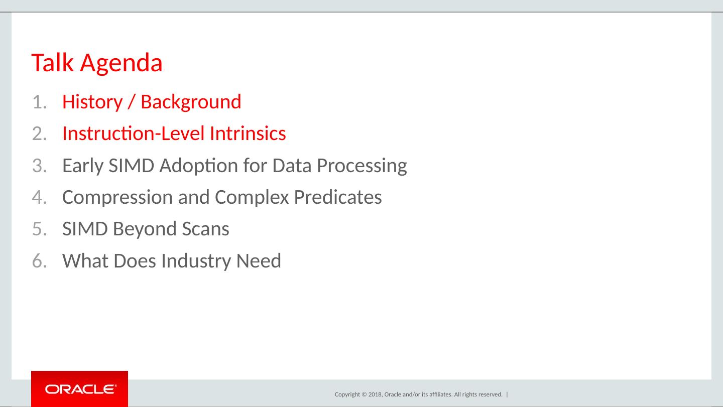 19 .Talk Agenda History / Background Instruction-Level Intrinsics Early SIMD Adoption for Data Processing Columnar Compression and SIMD SIMD Beyond Scans What Does Industry Need