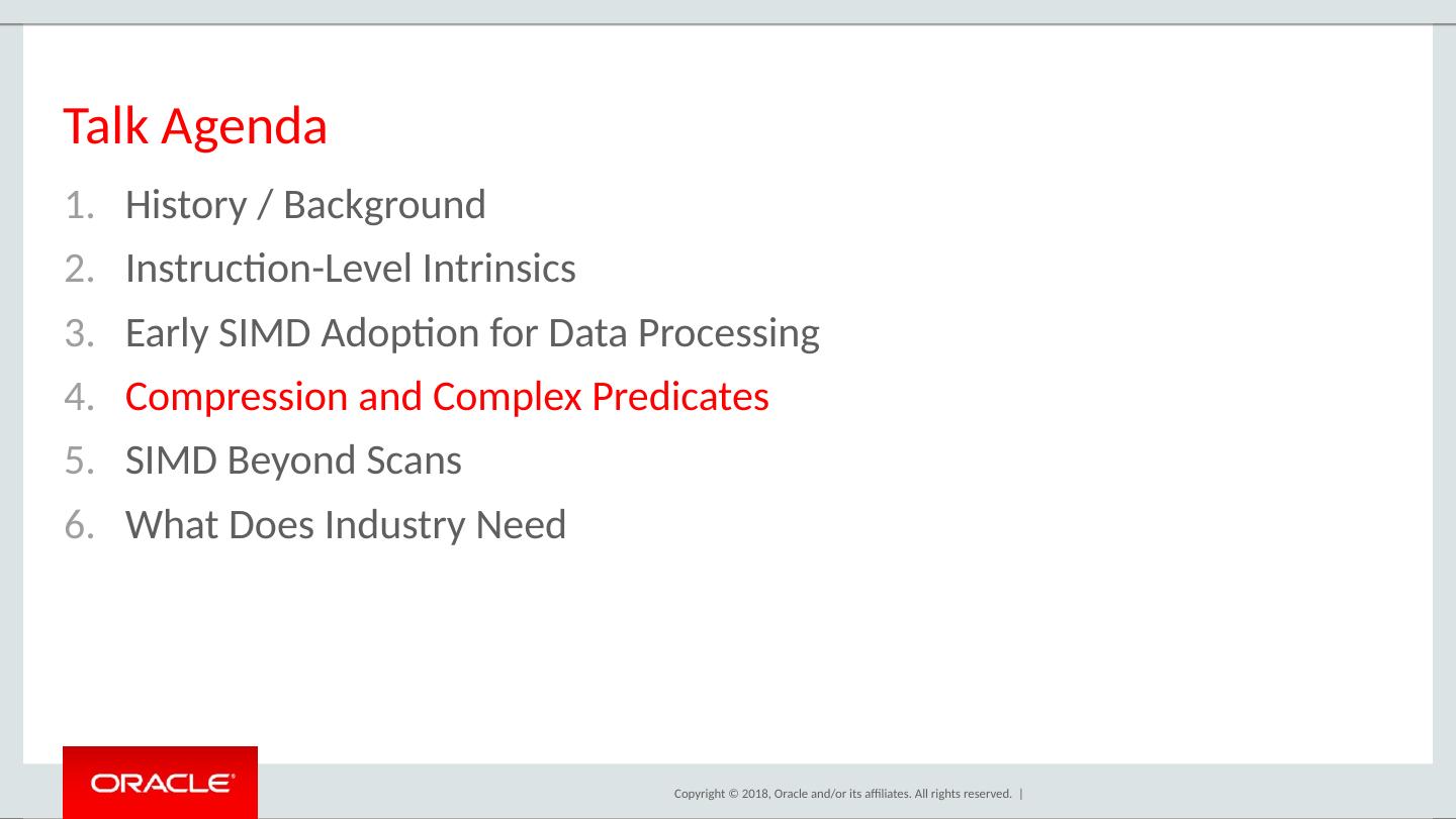 3 .Talk Agenda History / Background Instruction-Level Intrinsics Early SIMD Adoption for Data Processing Compression and Complex Predicates SIMD Beyond Scans What Does Industry Need