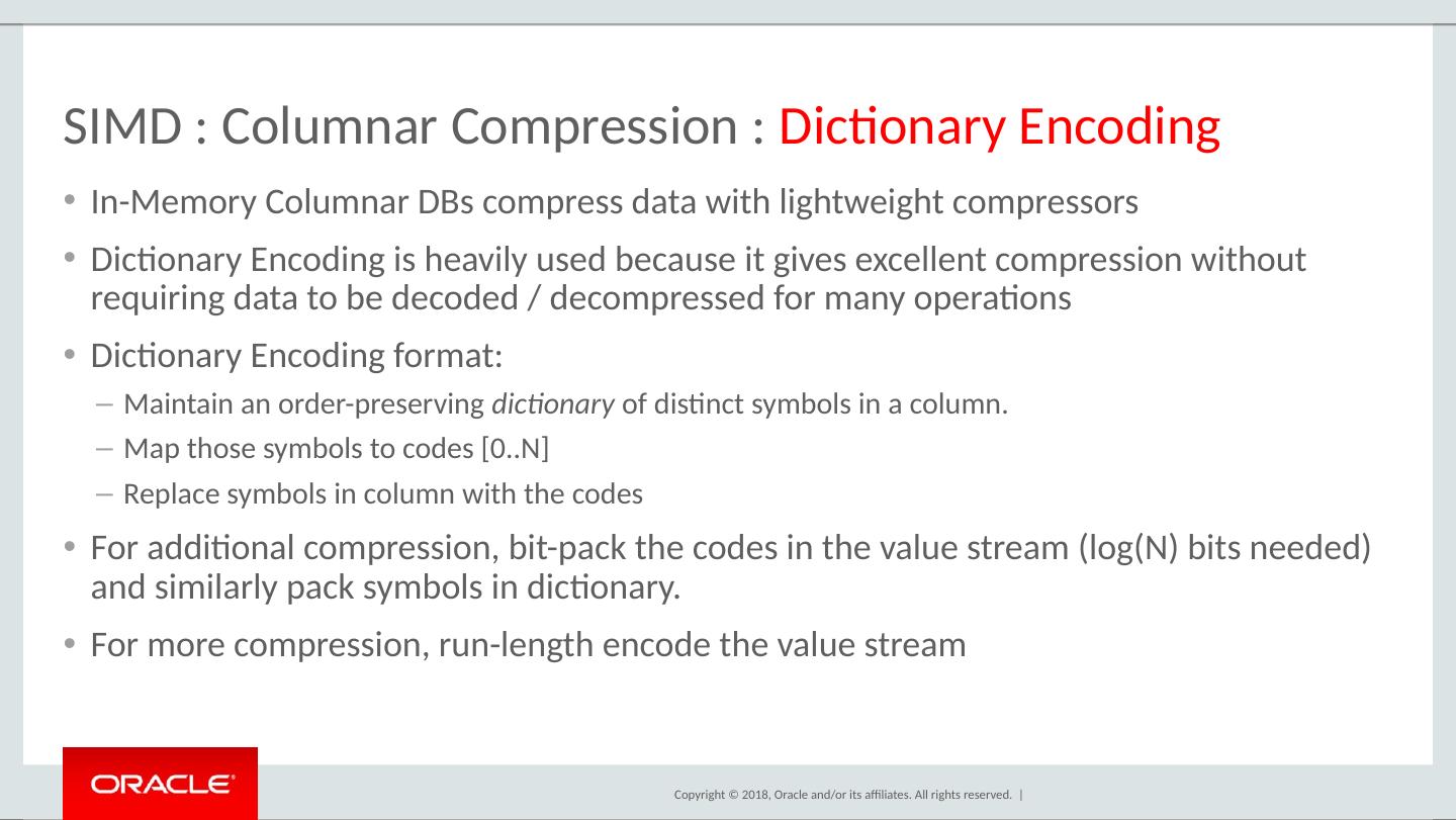 11 .SIMD : Columnar Compression : Dictionary Encoding In-Memory Columnar DBs compress data with lightweight compressors Dictionary Encoding is heavily used because it gives excellent compression without requiring data to be decoded / decompressed for many operations Dictionary Encoding format: Maintain an order-preserving dictionary of distinct symbols in a column. Map those symbols to codes [0..N] Replace symbols in column with the codes For additional compression, bit-pack the codes in the value stream (log(N) bits needed) and similarly pack symbols in dictionary. For more compression, run-length encode the value stream