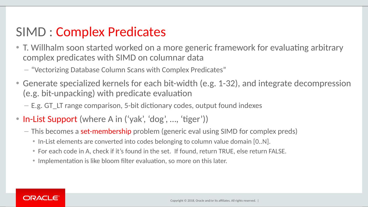 16 .SIMD : Complex Predicates T. Willhalm soon started worked on a more generic framework for evaluating arbitrary complex predicates with SIMD on columnar data “ Vectorizing Database Column Scans with Complex Predicates” Generate specialized kernels for each bit-width (e.g. 1-32), and integrate decompression (e.g. bit-unpacking) with predicate evaluation E.g. GT_LT range comparison, 5-bit dictionary codes, output found indexes In-List Support (where A in (‘yak’, ‘dog’, …, ‘tiger’)) This becomes a set-membership problem (generic eval using SIMD for complex preds ) In-List elements are converted into codes belonging to column value domain [0..N]. For each code in A, check if it’s found in the set. If found, return TRUE, else return FALSE. Implementation is like bloom filter evaluation, so more on this later.