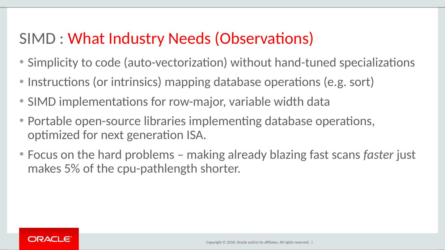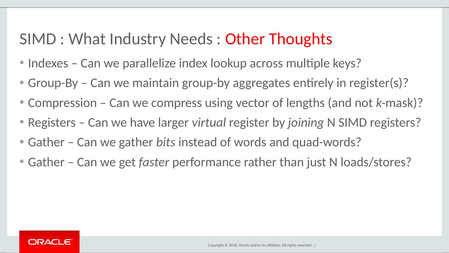 20 .SIMD : Selective Evaluation AVX-512 allows most instructions to conditionally / selectively execute the specified operation against elements in the SIMD register. A conditional 64-bit bitmap k is provided which indicates which of the 64 bytes in the SIMD register are to participate in the operation. Separate code-paths for optimal execution based on selectivity not needed Example : select count(*) from T where a > 10 and b < 20 If “a > 10” is highly selective, prior to AVX-512 we may not vectorize “b < 20” With AVX-512, we could use bitmap result from “a > 10” as conditional mask into SIMD execution of “b < 20”. Main benefit is to avoid loads of “b” and stores of result bit-map (assuming zero initialized). Pipelined operations benefit too (select sum(a) from T where b > 20 )