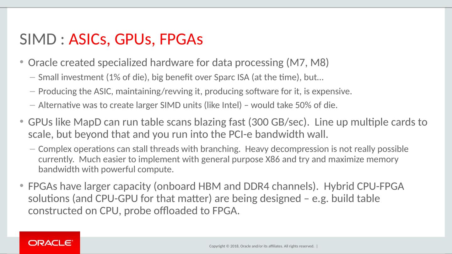 7 .SIMD : Early Adoption For Data Processing CPU and memory performance become bottleneck for columnar databases (in-memory processing and modern hardware). Intel SSE arrived w/ 128-bit SIMD registers and rich ISA to replace MMX Jingren Zhou and Kenneth Ross wrote in 2002 that SIMD technology can be employed in many database operations “Implementing Database Operations Using SIMD Instructions” , Sigmod 2002 SIMD Implementations for Database Operations Scans & Filters, Joins, Aggregations, Index Search