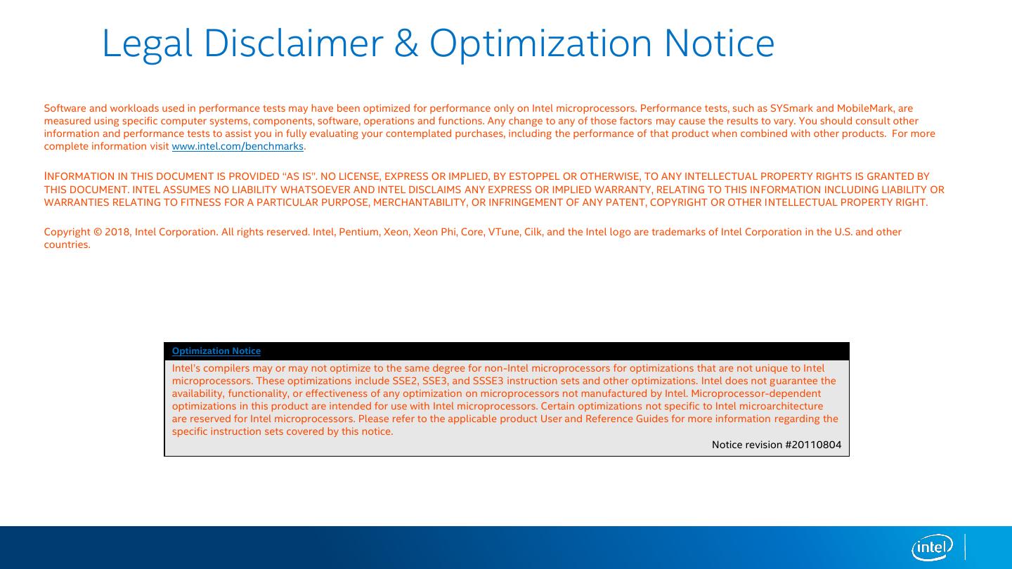 2 . Legal Disclaimer & Optimization Notice Software and workloads used in performance tests may have been optimized for performance only on Intel microprocessors. Performance tests, such as SYSmark and MobileMark, are measured using specific computer systems, components, software, operations and functions. Any change to any of those factors may cause the results to vary. You should consult other information and performance tests to assist you in fully evaluating your contemplated purchases, including the performance of that product when combined with other products. For more complete information visit www.intel.com/benchmarks. INFORMATION IN THIS DOCUMENT IS PROVIDED “AS IS”. NO LICENSE, EXPRESS OR IMPLIED, BY ESTOPPEL OR OTHERWISE, TO ANY INTELLECTUAL PROPERTY RIGHTS IS GRANTED BY THIS DOCUMENT. INTEL ASSUMES NO LIABILITY WHATSOEVER AND INTEL DISCLAIMS ANY EXPRESS OR IMPLIED WARRANTY, RELATING TO THIS INFORMATION INCLUDING LIABILITY OR WARRANTIES RELATING TO FITNESS FOR A PARTICULAR PURPOSE, MERCHANTABILITY, OR INFRINGEMENT OF ANY PATENT, COPYRIGHT OR OTHER INTELLECTUAL PROPERTY RIGHT. Copyright © 2018, Intel Corporation. All rights reserved. Intel, Pentium, Xeon, Xeon Phi, Core, VTune, Cilk, and the Intel logo are trademarks of Intel Corporation in the U.S. and other countries. Optimization Notice Intel’s compilers may or may not optimize to the same degree for non-Intel microprocessors for optimizations that are not unique to Intel microprocessors. These optimizations include SSE2, SSE3, and SSSE3 instruction sets and other optimizations. Intel does not guarantee the availability, functionality, or effectiveness of any optimization on microprocessors not manufactured by Intel. Microprocessor-dependent optimizations in this product are intended for use with Intel microprocessors. Certain optimizations not specific to Intel microarchitecture are reserved for Intel microprocessors. Please refer to the applicable product User and Reference Guides for more information regarding the specific instruction sets covered by this notice. Notice revision #20110804 2