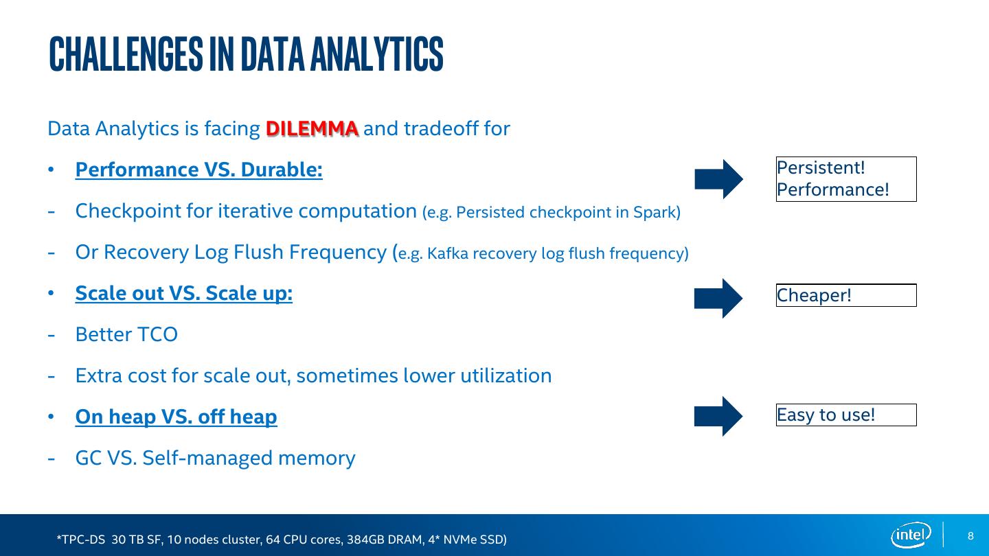 8 .challenges in data Analytics Data Analytics is facing DILEMMA and tradeoff for • Performance VS. Durable: Persistent! Performance! - Checkpoint for iterative computation (e.g. Persisted checkpoint in Spark) - Or Recovery Log Flush Frequency (e.g. Kafka recovery log flush frequency) • Scale out VS. Scale up: Cheaper! - Better TCO - Extra cost for scale out, sometimes lower utilization • On heap VS. off heap Easy to use! - GC VS. Self-managed memory *TPC-DS 30 TB SF, 10 nodes cluster, 64 CPU cores, 384GB DRAM, 4* NVMe SSD) 8