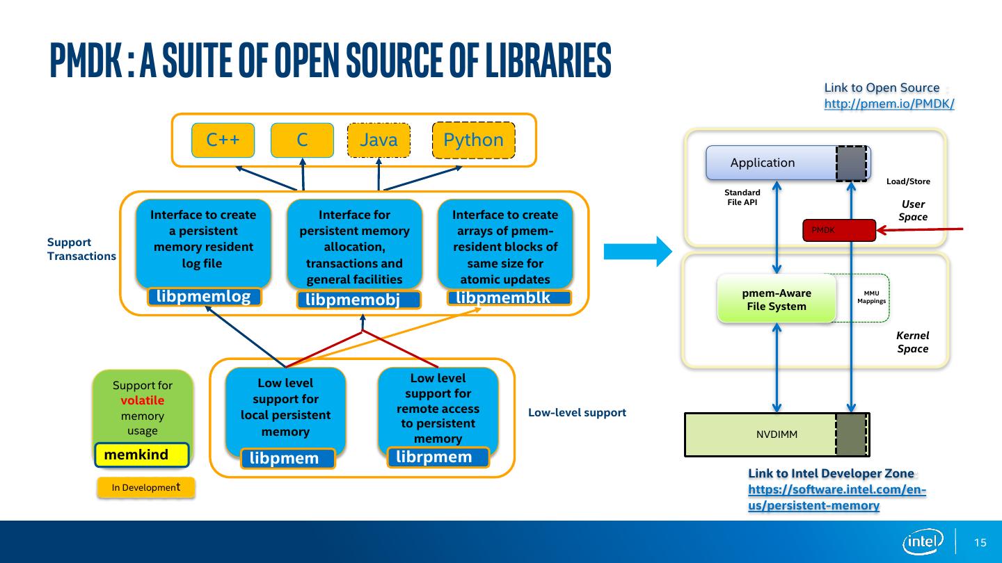 15 .PMDK : A Suite of Open Source of Libraries Link to Open Source : http://pmem.io/PMDK/ C++ C Java Python Application Load/Store Standard File API User Interface to create Interface for Interface to create Space a persistent persistent memory arrays of pmem- PMDK Support memory resident allocation, resident blocks of Transactions log file transactions and same size for general facilities atomic updates libpmemlog libpmemobj libpmemblk pmem-Aware File System MMU Mappings Kernel Space Low level Low level Support for support for support for volatile remote access Low-level support memory local persistent to persistent usage memory NVDIMM memory memkind libpmem librpmem Link to Intel Developer Zone: In Development https://software.intel.com/en- us/persistent-memory 15