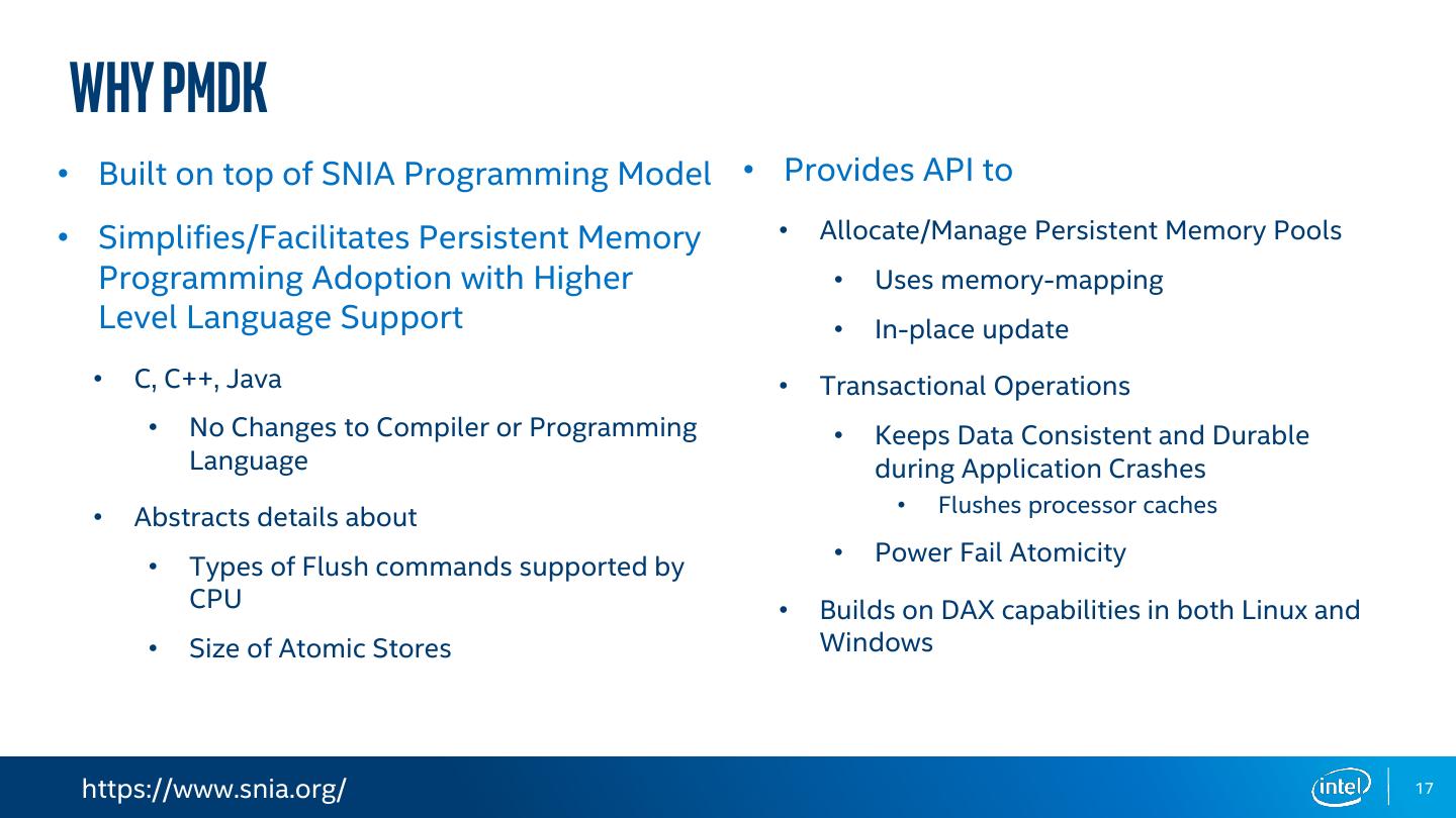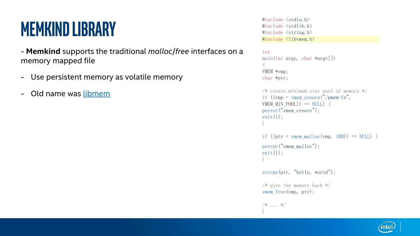 16 .Memkind library #include <stdio.h> #include <stdlib.h> #include <string.h> #include <libvmem.h> - Memkind supports the traditional malloc/free interfaces on a int memory mapped file main(int argc, char *argv[]) { VMEM *vmp; - Use persistent memory as volatile memory char *ptr; /* create minimum size pool of memory */ - Old name was libmem if ((vmp = vmem_create("/pmem-fs", VMEM_MIN_POOL)) == NULL) { perror("vmem_create"); exit(1); } if ((ptr = vmem_malloc(vmp, 100)) == NULL) { perror("vmem_malloc"); exit(1); } strcpy(ptr, "hello, world"); /* give the memory back */ vmem_free(vmp, ptr); /* ... */ }