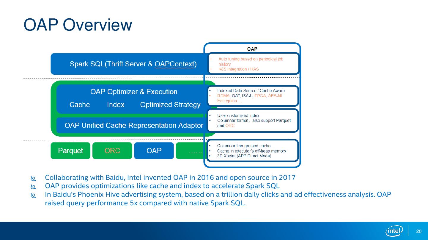 20 .OAP Overview Collaborating with Baidu, Intel invented OAP in 2016 and open source in 2017 OAP provides optimizations like cache and index to accelerate Spark SQL In Baidu’s Phoenix Hive advertising system, based on a trillion daily clicks and ad effectiveness analysis. OAP raised query performance 5x compared with native Spark SQL. 20