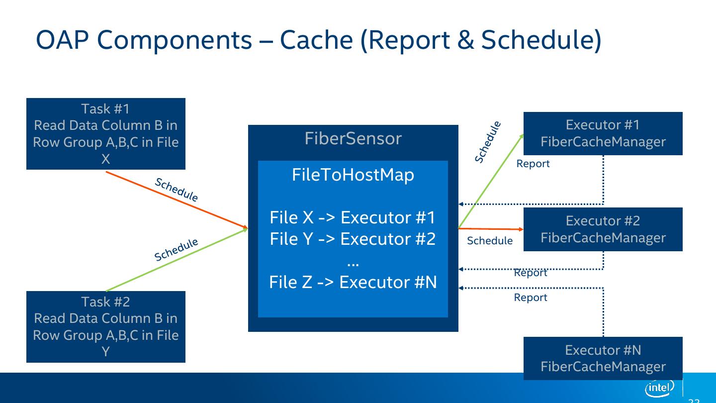 22 .OAP Components – Cache (Report & Schedule) Task #1 Read Data Column B in Executor #1 Row Group A,B,C in File FiberSensor FiberCacheManager X Report FileToHostMap File X -> Executor #1 Executor #2 File Y -> Executor #2 Schedule FiberCacheManager … Report File Z -> Executor #N Report Task #2 Read Data Column B in Row Group A,B,C in File Y Executor #N FiberCacheManager