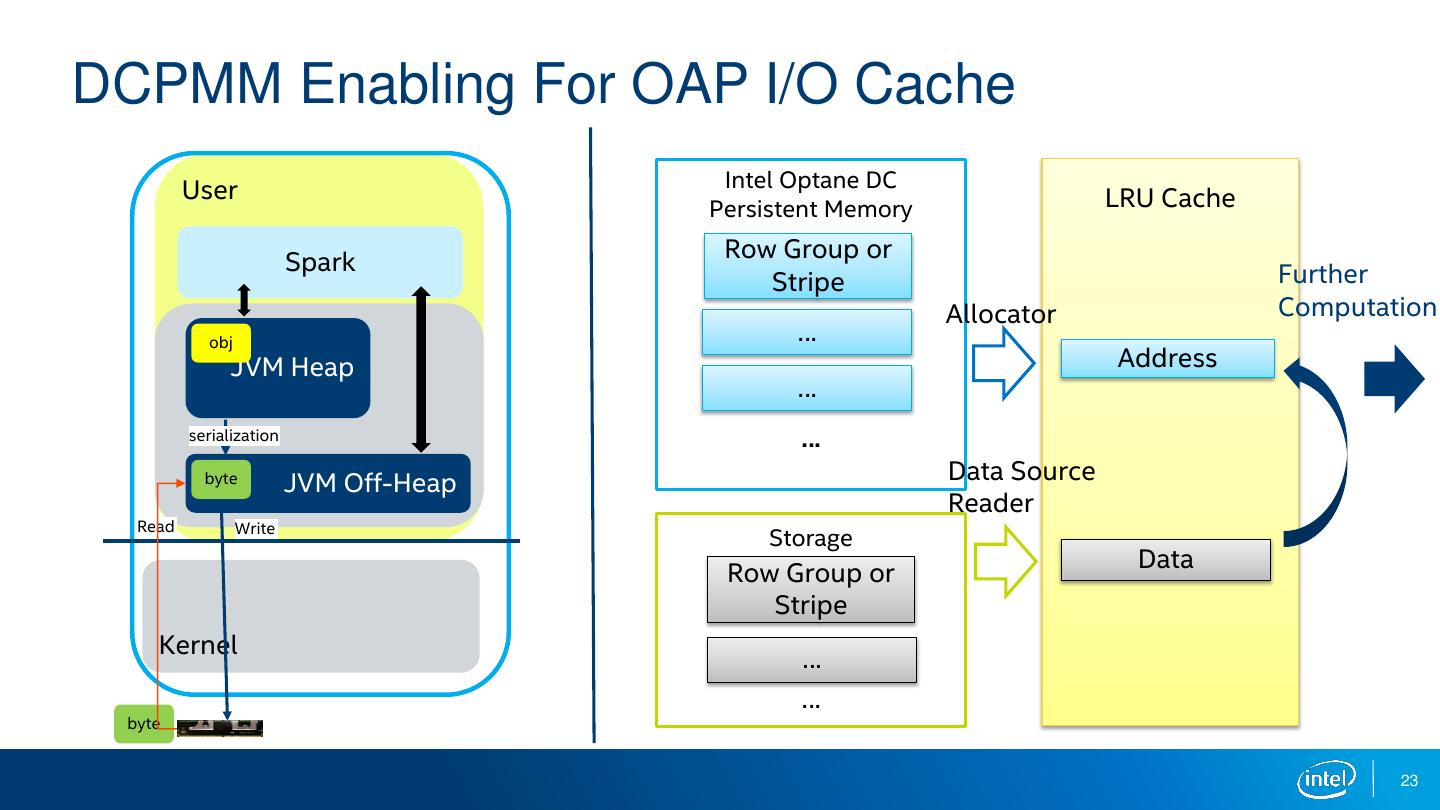 23 .DCPMM Enabling For OAP I/O Cache User Intel Optane DC Persistent Memory LRU Cache Spark Row Group or Stripe Further Allocator Computation obj … JVM Heap Address … serialization … byte JVM Off-Heap Data Source Reader Read Write Storage Data Row Group or Stripe Kernel … … byte 23